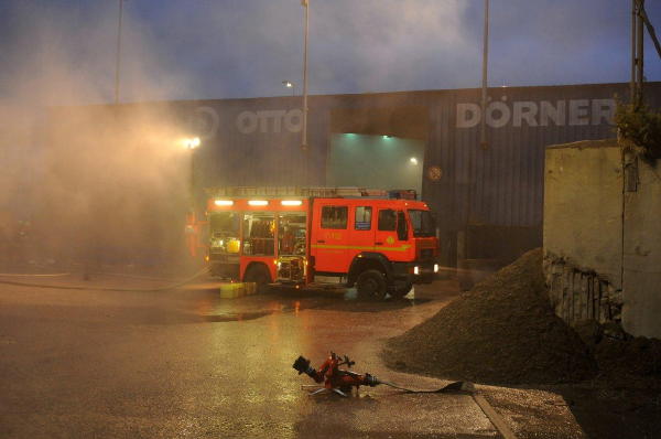 Der Inhalt dieser Halle in einem Gewerbegebiet nahe der BAB A7 ist aus ungeklärter Ursache in Brand geraten. Aufgrund des Objekts wurde sofort auf FEU 2 (2. Alarm, 2 Löschzüge Berufsfeuerwehr u. 2 Freiwillige Feuerwehren) abgefahren.
