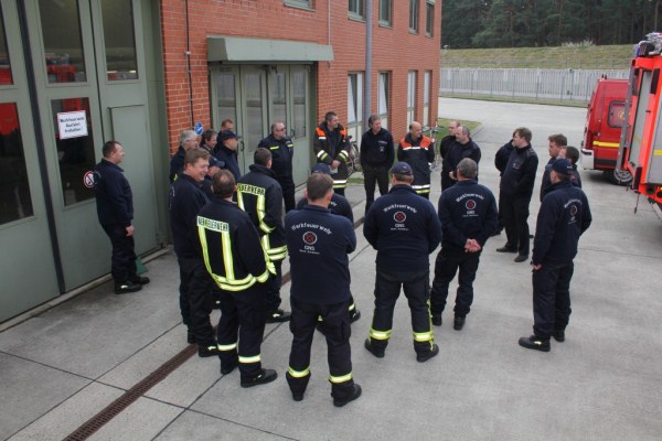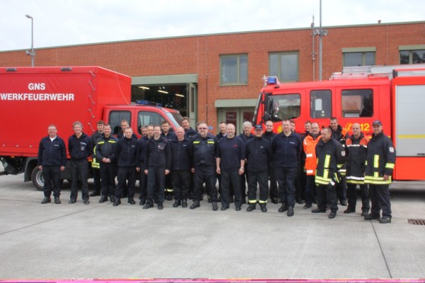 Nach umfangreichen Sicherheitskontrollen wurden wir auf das Gelände geschleust und trafen uns am Feuerwehrhaus der GNS Werkfeuerwehr (WF). Es folgte eine Begrüßung durch den Leiter der GNS Werkfeuerwehr, Edward Reinschild, und eine kurze Einweisung in die bevorstehende Übung, dem 1. Highlight des Besuchs.