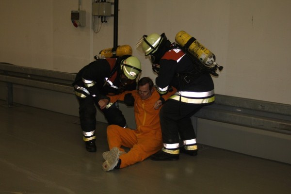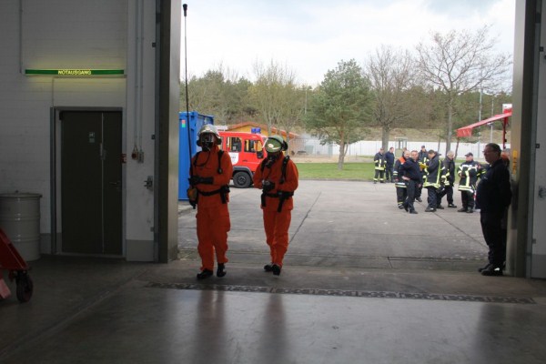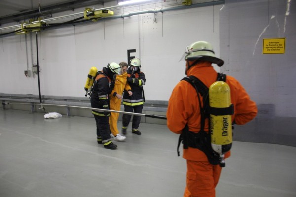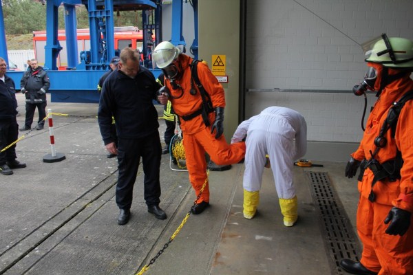 Der Angriffstrupp rüstete sich mit Nomexbekleidung und PA aus, der Kamerad Frank Steffen und ich mit Overgarments (zweiteilige Schutzanzüge) und PA. Dann erhielten wir noch unsere Filmdosimeter sowie Dosisleistungswarner und begaben uns in die Halle. Vor uns der Angriffstrupp, der sehr zügig die verletzte Person herausbrachte und dann auf seine Freimessung wartete.