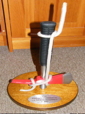 Bernd wurde vor allem für seine Kenntnisse und Fertigkeiten mit der Motorkettensäge erwähnt. Dieses Wissen gab er über Jahrzehnte an die Neumitglieder weiter. Heiko war mehr als 20 Jahre als Bereichsausbilder im Fach "Stiche und Bunde" sowie "Tragbare Leitern" aktiv. Er hat so manchen GAL geprägt. Dafür erhielt er als Ehrengeschenk von den Bereichsausbildern des Bereichs Altona ein mit Mastwurf und halbem Schlag ordnungsgemäß eingebundenes Feuerwehrbeil, befestigt auf einer Holzplatte mit Plakette.