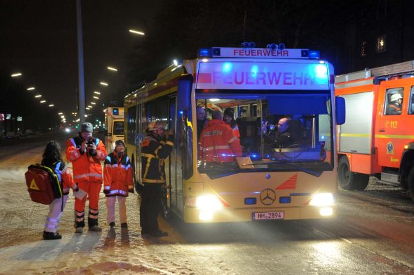 Insgesamt wurden 22 Personen und 4 Hunde aus den Wohnungen gerettet und vorübergehend in dem nachgeforderten Großraumrettungswagen untergebracht.