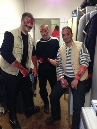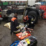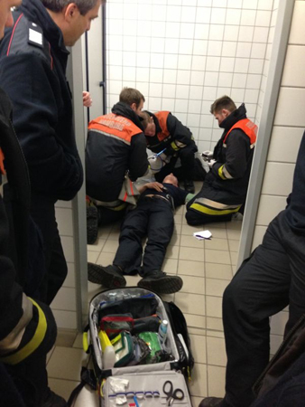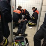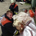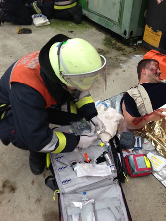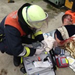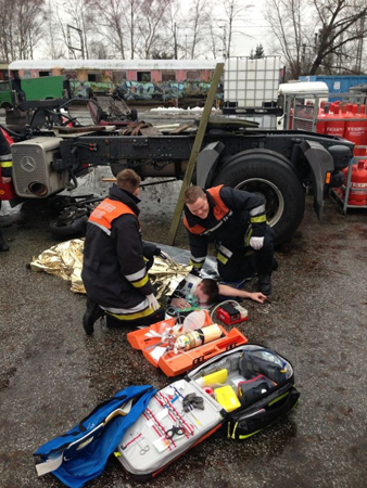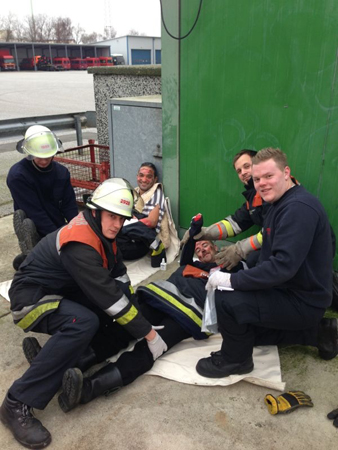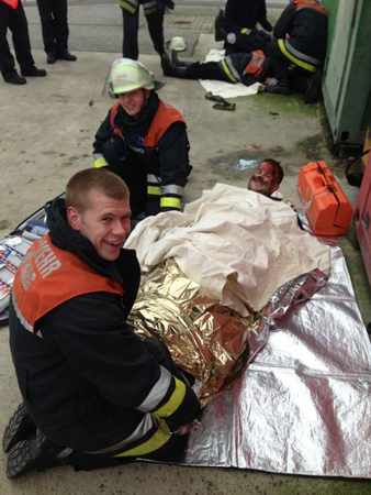 Die erste Lage, die der Trupp abarbeiten musste, war eine Venöse-Schnittverletzung am Unterarm, die natürlich fachgerecht mit einem Druckverband versorgt wurde. Nachdem wir mit der Nachbesprechung der Lage durch waren, gingen wir alle gemeinsam zum Mittagessen. Wir wunderten uns alle warum auf einmal ein Rettungswagen vor dem Trainingszentrum (TZ) stand. Die eben durchgespielte Lage wurde dort zum realen Fall. Ein dort arbeitender Teppichausreißer hat sich mit der Hakenklinge in den Unterarm geschnitten.