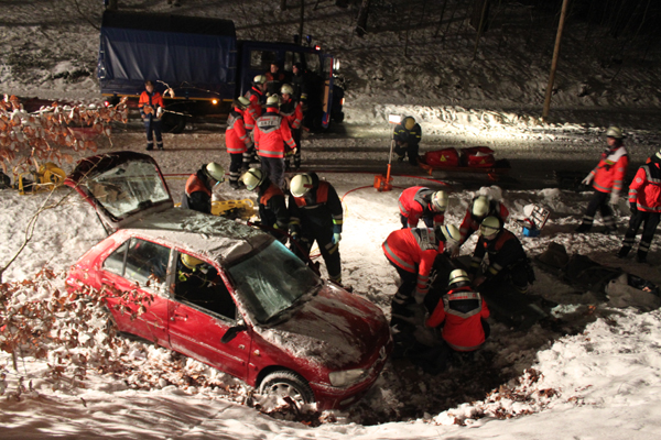 Das THW bespricht nun mit der eingetroffenen Feuerwehr das Vorgehen bei der technischen Rettung. Da der Patient im PKW langsam das Bewusstsein verliert, entscheidet sich der Notarzt zu einer sog. Crash-Rettung. Das bedeutet die technische Rettung muss schnell, aber dennoch schonend durchgeführt werden. Während ein Kamerad im Auto die Betreuung übernimmt, beginnen die Feuerwehrleute mit dem Zerschneiden des Autowracks.
