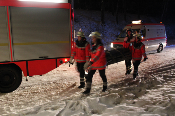 Der Notarzt zieht mit dem Organisatorischem Leiter eine erste Bilanz. 10 Patienten, davon einer eingeklemmt und einer vermisst. So wird gleich ein Trupp der eintreffenden SEG mit Notfallausrüstung und Taschenlampe in den Wald geschickt, um dem Vermissten zu suchen. Einige hundert Meter weiter finden sie ihn völlig unterkühlt und bewusstlos im Wald – unverletzt. Zusammen mit dem THW wird der Patient zur Sammelstelle getragen, die inzwischen eingerichtet wurde. Dort wird er weiter betreut.