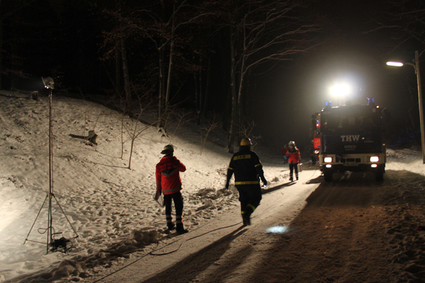 Kurz darauf trifft das THW an der Einsatzstelle ein und der Gruppenführer beginnt sofort mit der Erkundung der Einsatzstelle. Schnell wird eine Rückmeldung an die Leitstelle gegeben, da treffen auch schon RTW und NEF ein. Der Notarzt beginnt mit der Sichtung der Patienten. Das THW baut derweil die Ausleuchtung der Einsatzstelle auf und betreut die Leichtverletzten. Der Patient, den es bei dem Unfall am schlimmsten getroffen hat, ein 11 jähriger Junge, wird sofort mit schweren Hüft- und Bauchverletzungen ins Krankenhaus gefahren. Hier zählt jede Sekunde.