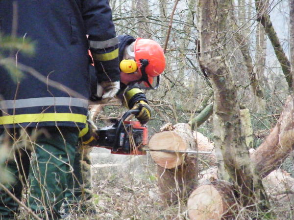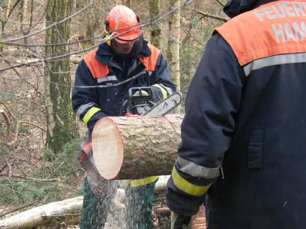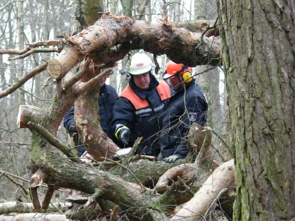 Den ganzen winterlichen Tag über – zum Teil sogar bei etwas Sonnenschein – wurden verschiedene Schnitttechniken, druck- und zugseitige Holzbearbeitung, das Entasten und die Wartung der Motorkettensägen gezeigt und geübt. Das Waldstück mit viel Bruchholz bot dafür hinreichend Gelegenheit. Alle beteiligten Wehren hatten ihre Schnittschutzausrüstungen sowie die Kettensägen der 2. LF für die Teilnehmer zur Verfügung gestellt, so dass ein wiederholtes zeitraubendes Umziehen der Schutzkleidung entfallen und auf eine große Anzahl Sägen zugegriffen werden konnte. Dadurch konnte sehr viel Praxis vermittelt werden.