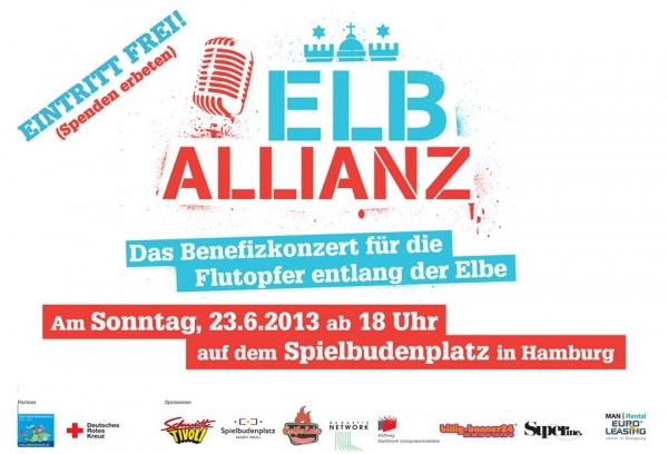 Am kommenden Sonntag, dem 23.6. um 18 Uhr wird auf dem Spielbudenplatz der Reeperbahn ein Benefizkonzert zugunsten der Flutopfer entlang der Elbe stattfinden. Der Erlös geht zu 100% an die Betroffenen des Hochwassers. Die Künstler verzichten komplett auf ihre Gage und auch die Bühnentechnik wird gespendet. Gesammelt werden die Spenden vom Deutschen Roten Kreuz. Mit dabei sind so namhafte Künstler wie Revolverheld, Sasha, Annett Louisan, Karl Dall etc. Zahlreiche Pressevertreter werden vor Ort sein.