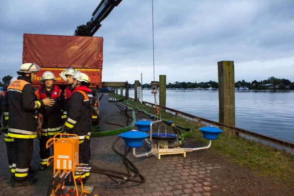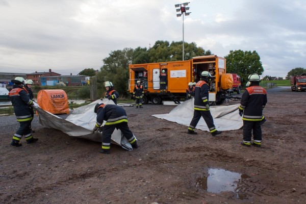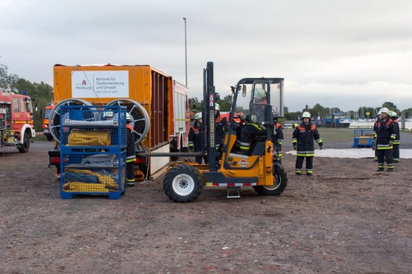 Es trafen sich die Kameraden der Wehren Curslack, Fünfhausen und Warwisch am Freitag, den 20.09.2013 um 17 Uhr am Feuerwehrhaus. Nach einer kurzen Besprechung mit dem Übungsleiter Karsten Dabelstein, BERF Vierlande, machten sich die Einheiten auf den Weg zum Hafen Ortkaten. Dort angekommen wurden die Gerätschaften wie der SEPCON Anhänger, der 70 Kubikmeter Vorlagenbehälter, zwei 30 Kubikmeter Vorlagenbehälter, der Skimmer mit seinem Powerpack, diverse Pumpen mit ihren Hydraulikschläuchen und die gesamte Dekontiminationseinheit an Ihren Platz gebracht und aufgebaut.