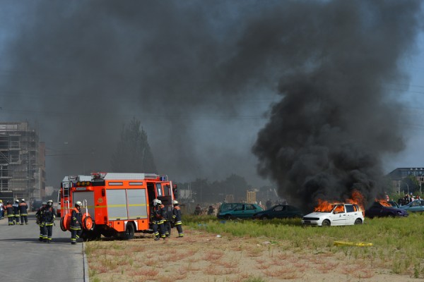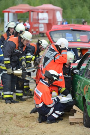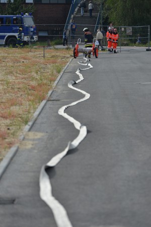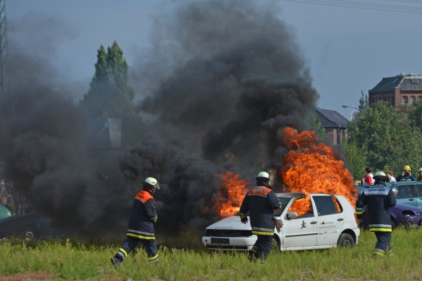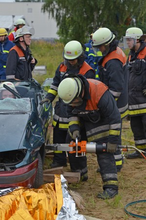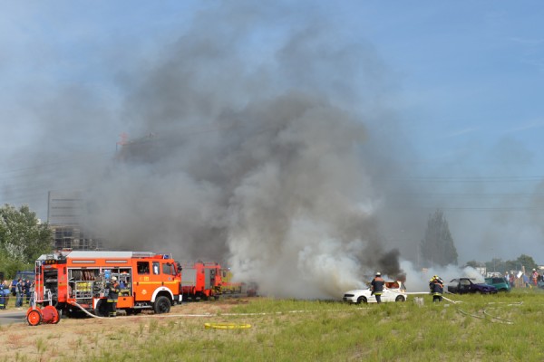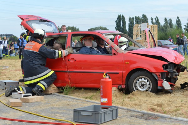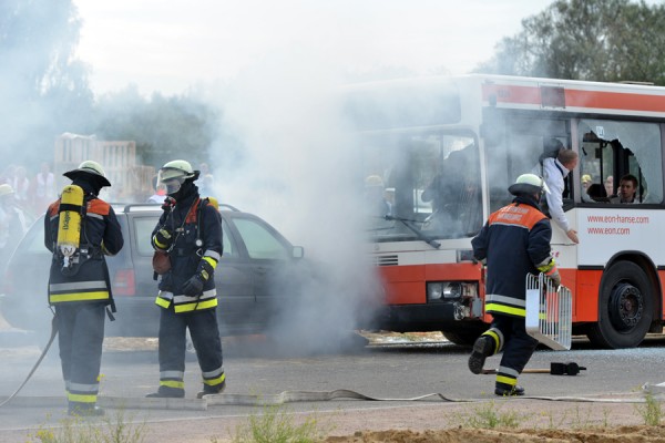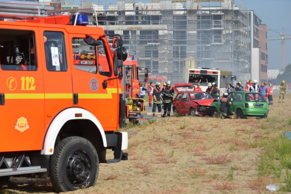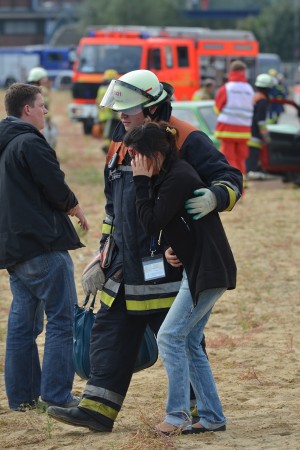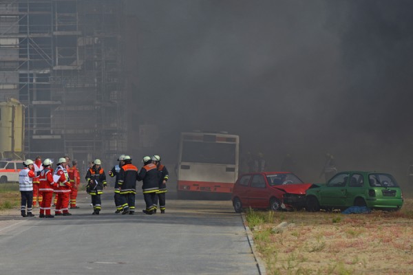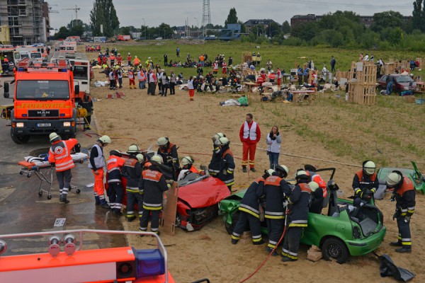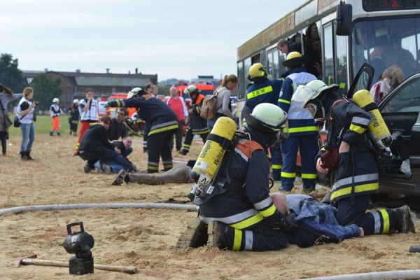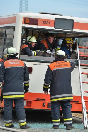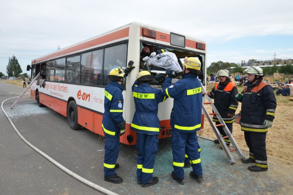 Ein großes Trümmerfeld, überall liegen verletzte zwischen den Flohmarktständen, einige sind im Pkw eingeklemmt oder in einem Linienbus eingeschlossen. Es kam zu einer großen Explosion an der Absturzstelle des Kleinflugzeugs auf der Bahnhofsinsel in Hamburg Harburg. Mit dem Absetzen des Notrufes begann kurz nach 10 Uhr die Katastrophenschutzübung „BOSex 2013“ in Hamburg. Einige Minuten vergingen bis die ersten alarmierten Rettungskräfte an der Unglückstelle eintrafen. Zwei Pkws explodierten, zwei weitere fingen Feuer, einer davon war gegen den vollbesetzten Linienbus gefahren. Während die Mannschaft eines der ersteintreffenden Löschfahrzeuge die brennenden Pkws löschte, versuchten sich die Führungskräfte einen Überblick der Lage zu machen. Über eine lange Wegstrecke musste die Wasserversorgung aufgebaut werden. Hilferufe kamen von überall, einige verletzte versuchten die Rettungskräfte zu sich zu holen. Zusammen mit dem Technischen Hilfswerk wurden die eingeschlossen Personen aus dem Linienbus befreit und betreut. Mit der Trage wurden die Verletzten durch das zerstörte Heckfenster gerettet, die nicht mehr gehen konnten. Immer mehr Rettungskräfte der Hilfsorganisationen trafen ein, Notärzte führten eine Sichtung durch und verteilten Verletztenanhängekarten. Ein Kriseninterventionsteam kümmerte sich um viele Betroffene. Mit schweren hydraulischen Geräten wurden die Dächer der Pkws abgetrennt und die eingeklemmten Personen von der Feuerwehr und dem THW gerettet, dabei war das mobile Hydraulikgerät des THW abseits der Straße vom Vorteil. Verletztensammelstellen wurden aufgebaut und der Abtransport bis zum Krankenhaus Altona durchgeführt.