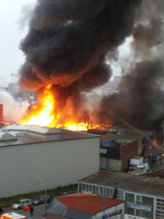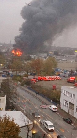 Nach nunmehr 4 Stunden sind gegen 19 Uhr 4 Löschzüge der Berufsfeuerwehr, 12 Freiwillige Feuerwehren und eine große Anzahl an Führungskräften und Sonderfahrzeugen sowie ein Löschboot immer noch damit beschäftigt, die Halle zu löschen und das Übergreifen der Flammen auf einen weiteren Hallenteil zu verhindern (ca. 160 Einsatzkräfte im Einsatz). Über das System KATWARN wurden die Anwohner aufgefordert, Fenster und Türen nach draußen geschlossen zu halten.