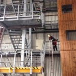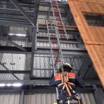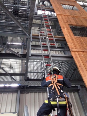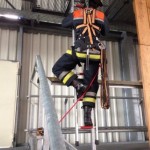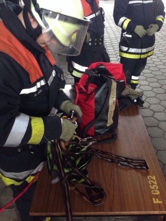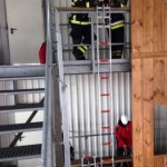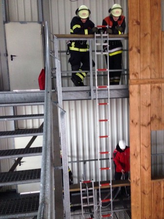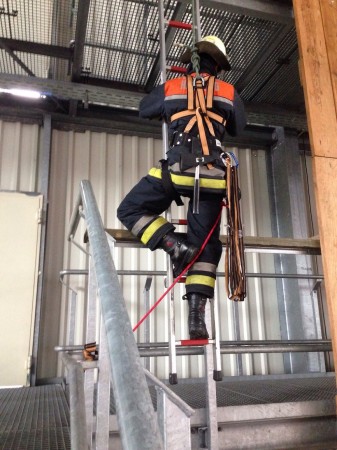 Hier konnte jeder Lehrgangsteilnehmer unter Anleitung selbst ausprobieren, wie man mittels angelegtem Klettergeschirr in diesem Fall senkrecht eine Hakenleiter besteigt und sich anhand der Karabinerhaken und Bandschlingen gegen das Abstürzen sichert.