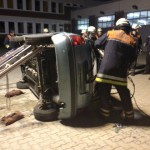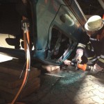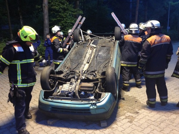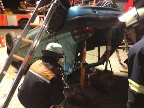 Zunächst wurde geübt, eine Person aus einem PKW zu retten, der sich überschlagen hatte. Die „Dachlage“ ist besonders knifflig, insbesondere wenn hierfür nur ein Hilfeleistungssatz mit unterschiedlich langen Hydraulikzylindern zur Verfügung steht – und wir wollten nur mit unserem eigenen Equipment üben, was wir im Realeinsatz auch zur Verfügung haben. Hierzu wird das verunfallte Fahrzeug mit Steckleiterteilen an der Hinterachse gesichert, während die Hydraulikzylinder die Öffnung der Heckklappe vergrößern. Zuvor wird die kopfüber im Sicherheitsgurt hängende Person mittels Rüsthölzern und Mini-Hebekissen stabilisiert. Hierbei haben wir gelernt, wie sich der PKW bewegt, wenn die Rettungszylinder nicht synchron ausgefahren werden. Aber Übung macht ja bekanntlich den Meister.