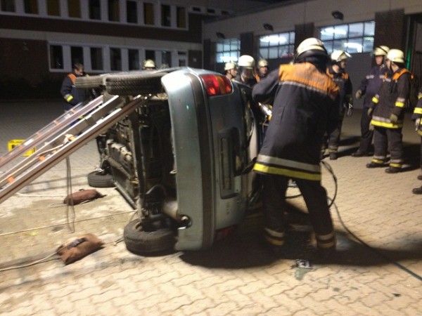 Zunächst wurde geübt, eine Person aus einem PKW zu retten, der sich überschlagen hatte. Die „Dachlage“ ist besonders knifflig, insbesondere wenn hierfür nur ein Hilfeleistungssatz mit unterschiedlich langen Hydraulikzylindern zur Verfügung steht – und wir wollten nur mit unserem eigenen Equipment üben, was wir im Realeinsatz auch zur Verfügung haben. Hierzu wird das verunfallte Fahrzeug mit Steckleiterteilen an der Hinterachse gesichert, während die Hydraulikzylinder die Öffnung der Heckklappe vergrößern. Zuvor wird die kopfüber im Sicherheitsgurt hängende Person mittels Rüsthölzern und Mini-Hebekissen stabilisiert. Hierbei haben wir gelernt, wie sich der PKW bewegt, wenn die Rettungszylinder nicht synchron ausgefahren werden. Aber Übung macht ja bekanntlich den Meister.