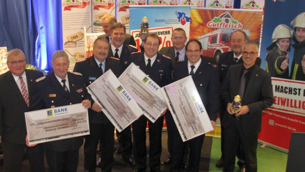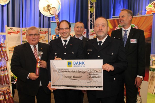 Am Mittwoch, dem 2. April 2014, nahmen Vertreter der fünf norddeutschen Landesfeuer- wehrverbände im Rahmen der internen EDEKA Nord Frühjahrsmesse in den Holstenhallen Neumünster Schecks im Gesamtwert von rund 55.000 Euro aus den Händen von Carsten Koch und Martin Steinmetz (beide Geschäftsführer EDEKA Nord) und Stephan Weber (Ge- schäftsführer EDEKA-Fleischwerk Valluhn) entgegen. Mit dabei war auch Landtagspräsident Klaus Schlie, der besonders lobende Worte für das soziale Engagement der EDEKA Nord fand: „EDEKA ist ein Vorbild für die Übernahme gesellschaftlicher Verantwortung. Der Dienst in einer Freiwilligen Feuerwehr muss mehr und mehr als gesamtgesellschaftliche Aufgabe erkannt und in das Bewusstsein der Menschen transportiert werden. Mit dem Geld lassen sich erneut hervorragende Maßnahmen der Öffentlichkeitsarbeit umsetzen.“