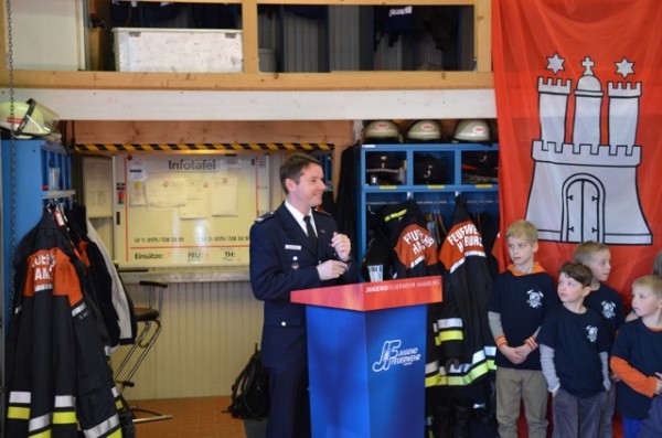 Als zweiter Redner hat Oberbranddirektor Klaus Maurer der Wehr zur Gründung der Minifeuerwehr beglückwünscht und hat den Kindern als Geschenk einen Fußball inkl. Zubehör mitgebracht. Den Glückwünschen hat sich unser Landesbereichsführer André Wronski angeschlossen und als dritter Gratulant den Kinder auch ein Präsent überreicht. Das nächste Geschenk hat bei seinem Grußwort der Landesjugendfeuerwehrwart Uwe von Appen durch den Landesjugendsprecher Lionel Heilmann den Kindern überbracht. Spiele für die schlechte Jahreszeit.