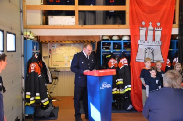 Um 12 Uhr begann dann der offizielle Gründungsakt im Feuerwehrhaus. Die Gäste sind alle eingetroffen und der Wehrführer Andreas Meyer begrüßte die Anwesenden. Unter dem Motto nach Erich Kästner „Es gibt nichts Gutes, außer man tut es“, begann der Wehrführer seine Rede. In seinem Grußwort hat er den Initiatoren und Betreuern für Ihre Arbeit gedankt, ebenfalls dankte er der Kindertagesstätte Himmelsstürmer e.V., die der Minifeuerwehr in pädagogischen Sachfragen und der Gestaltung der Zusammenkünfte unterstützen. Er wünschte den Minis viel Spaß bei Ihren Zusammenkünften und sicherte Ihnen seine Unterstützung zu.