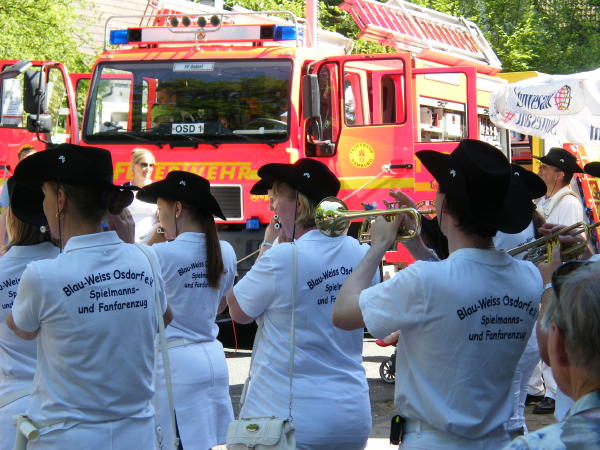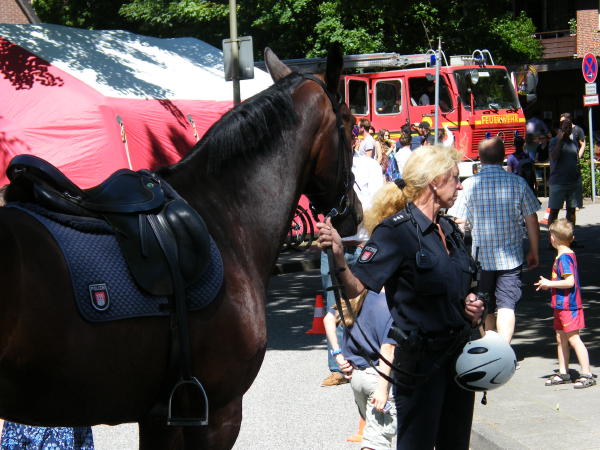Untermalt wurde alles von der Combo des Polizeiorchesters und dem Spielmannszug Blau-Weiß Osdorf. Weiterhin waren die Reiterstaffel der Polizei und die Diensthunde vor Ort, die plastisch darstellten, was zupacken heißt. Schließlich dazu noch ein ehemaliges Unimog 404 S-Löschfahrzeug TLF 8 der FF Osdorf, das bis 1984 am Gerätehaus im Blomkamp stationiert war.