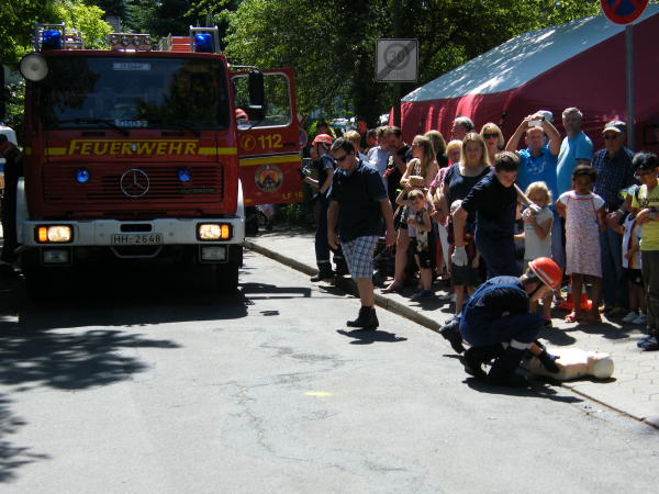 Schließlich liessen sich am letzten Samstag mehrere tausend Besucher die Räume des PK 26 zeigen, hörten in einer Zelle Kriminalgeschichten, lauschten gespannt dem Polizeikasper, sahen sich die Fahrzeuge von Feuerwehr und Polizei an, verfolgten die Einsatzübungen Festnahme eines Täters, Reanimation einer Person sowie Löschen eines Feuers und stärkten sich an den vielen Grill- und Kuchenspezialitäten, die u.a. von den Frauen der Wehrmitglieder angeboten wurden.