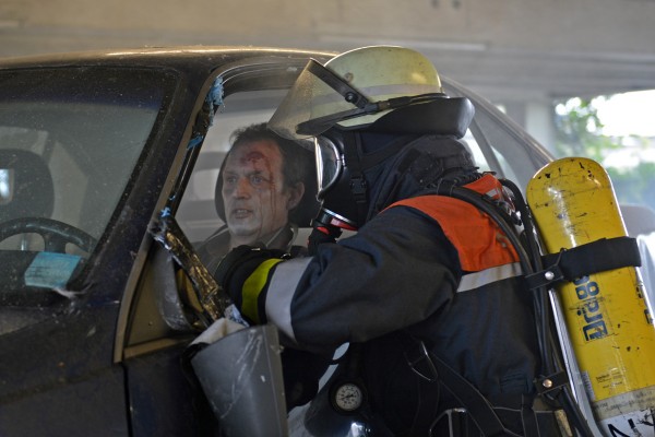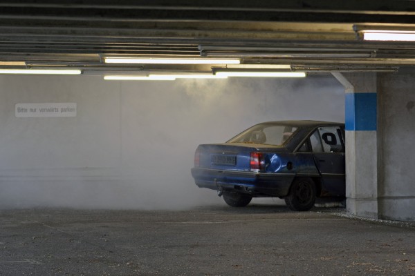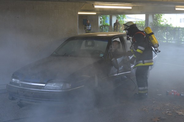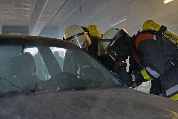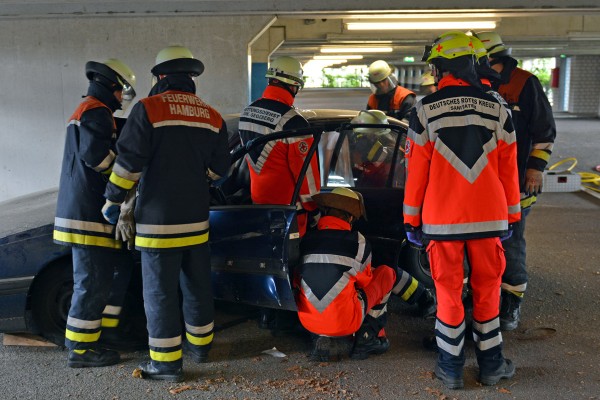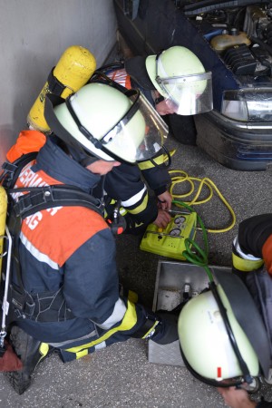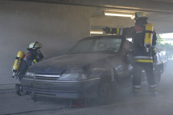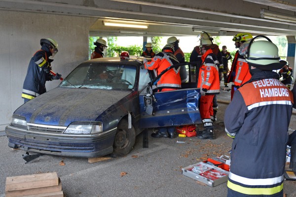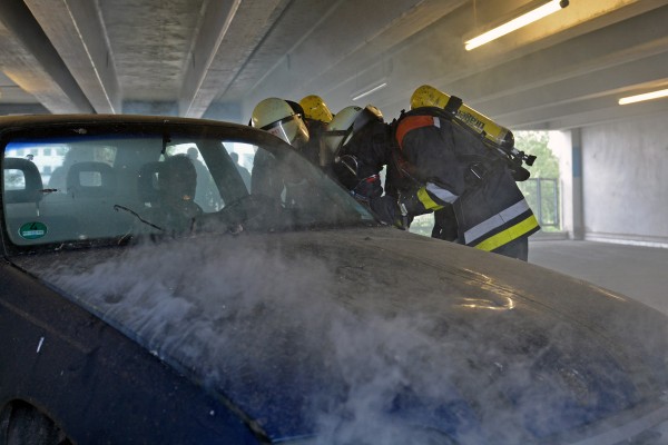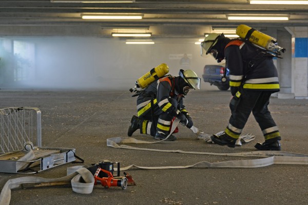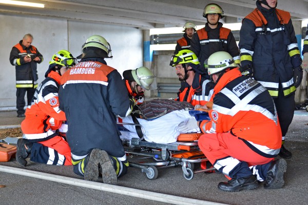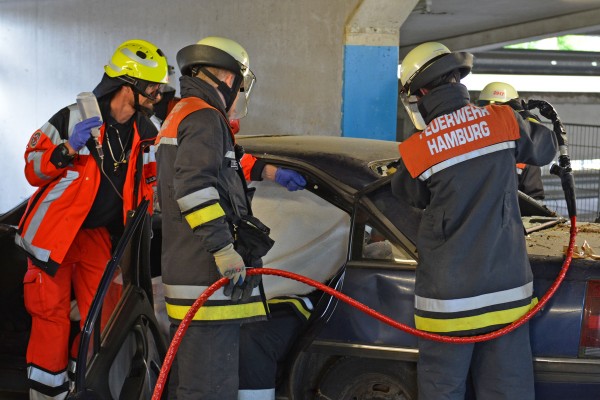 Beim Eintreffen am Einsatzort wurde dem 1. Gruppenführer vom Pförtner des Studio Hamburg eine Rauchentwicklung im 3.OG des Parkhauses mitgeteilt. Nach ersten Erkundungsmaßnahmen erfolgte rasch der Aufbau eines Löschangriffs in die oberen Etagen. Ein PKW wurde als Rauchquelle ausgemacht. Unmittelbar nach Einleiten des Löschangriffs durch den ersten Trupp wurde eine Person auf dem Fahrersitz entdeckt, kurz darauf eine weitere unter dem PKW. Unverzüglich wurde durch den Gruppenführer der Einsatz von schwerem technischen Gerät befohlen, um die Person unter dem PKW mittels Hebekissen und Spreizer zu befreien.