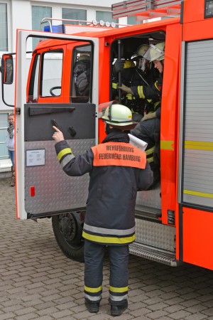Nach einem gemeinsamen Frühstück am Feuerwehrhaus von F  2916 ging es für die Rahlstedter vorerst an die Feuer- und Rettungswache Wandsbek (F21) zur Drehleitereinweisung.