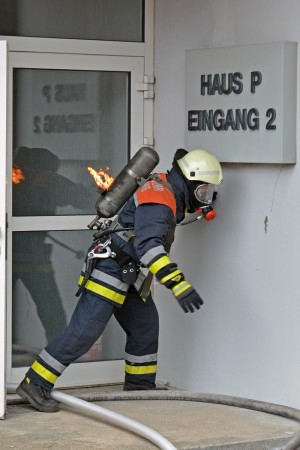 Schließlich erfolgte gegen 14 Uhr ein weiterer Meldereinlauf im Studio Hamburg. Der Melder wurde im Haus P im 1.OG ausgelöst. Nach ersten Erkundungsmaßnahmen konnte eine starke Verqualmung im besagten Stockwerk ausgemacht werden, zudem erfolgte durch offene Fenster ein erster Kontakt zu einer noch im Gebäude befindlichen Person, welche Auskunft über eine Explosion und weitere Vermisste gab. Dementsprechend wurden weitere Einheiten nachalarmiert, der Rettungsdienst wurde durch den DRK KV Altona und Mitte sowie durch den Leitenden Notarzt Kreis Segeberg ergänzt. Zudem wurde die FF Winterhude (F 2928) und der BERF/V 29/1 durch die Einsatzzentrale mit zugeordnet. Währenddessen haben bereits mehrere Trupps das Gebäude zur Menschenrettung betreten, neben dem Treppenhaus wurde mittels Schiebleiter ein weiterer Zugang in das betroffene Stockwerk eingerichtet. Mit den nachgerückten Einheiten konnte die Situation schnell unter Kontrolle gebracht werden, sämtliche Brandherde im 1.OG wurden rasch gelöscht, ein Großteil der Verletzten war bereits gerettet. Plötzlich kam es jedoch zu einem Atemschutznotfall, die Flasche eines Atemschutzgeräteträgers hatte Feuer gefangen, der betroffene Kamerad stürmte schreiend aus dem Haupteingang …