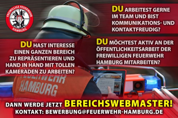 Aktuell suchen wir für den Bereich Altona nach einem neuen Bereichswebmaster, der sich der Herausforderung der Öffentlichkeitsarbeit der Freiwilligen Feuerwehr Hamburg stellen möchte!