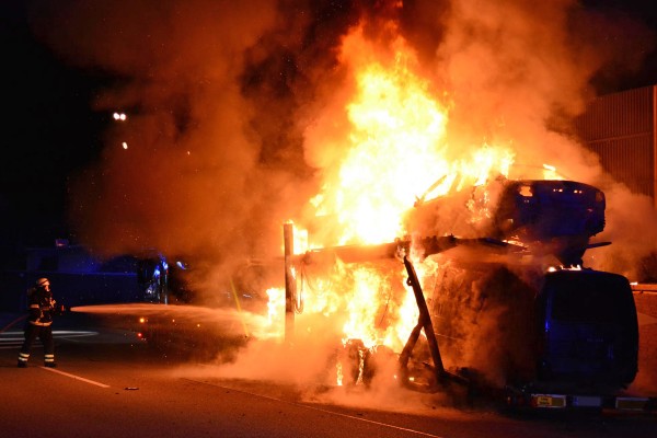 Die Zugmaschine konnten nach Beenden der Nachlöscharbeiten vom Anhänger getrennt werden. In Rücksprache mit dem angerückten Umweltdienst wurde ein großer Wall mit Ölbindemittelsäcken errichtet, um die ausgelaufenen Betriebsstoffe aufzufangen.