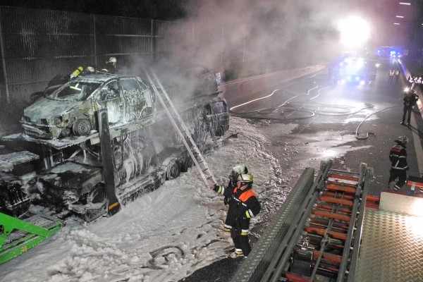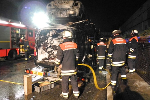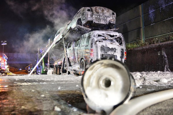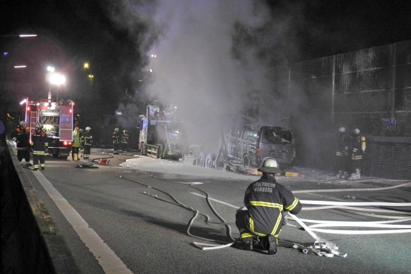 Bereits auf der Anfahrt war ein Feuerschein mit einer starken Rauchentwicklung am Himmel zu erkennen. Nachdem sich die Einsatzkräfte den Weg durch den stehenden Verkehr auf der Autobahn 1 zwischen Billstedt bis kurz vor den Tunnel des Güterbahnhofes Billwerder-Moorfleet frei gemacht hatten, konnten sie, am Einsatzort eingetroffen, mit dem Löschangriff beginnen. Vor Ort stand ein  Anhänger, beladen mit vier alten Fahrzeugen und diversen technischen Bauteilen, in Vollbrand. Die Fahrzeuge auf dem vorderen Teil des Autotransporters waren im Heckbereich bereits geschmolzen und qualmten stark. Mit zwei C-Rohren wurde der erste Löschangriff eingeleitet. Die Wasserversorgung wurde anfangs durch die Einspeisung zweier Löschfahrzeuge sichergestellt, später konnte ein Unterflurhydrant im Bereich der Tunneleinfahrt ausfindig gemacht werden. Zusätzlich wurde ein Wechselladerfahrzeug mit einem Abrollbehälter – Wasser (8.000 Liter Fassungsvolumen) alarmiert. Immer wieder schlugen die Flammen unter den Fahrzeugen hoch. Mit einem Löschnagel wurde das Feuer unter den unteren Fahrzeugen bekämpft. Mit Steckleiterteilen verschafften sich die Einsatzkräfte einen Zugang zu den oberen Fahrzeugen und öffneten diese mit dem Halligan-Tool. Durch den Einsatz eines Schaumrohres konnten die beladenen Fahrzeuge schnell gelöscht, sowie ein Übergreifen der Flammen auf den vordereren Teil des LKW erfolgreich verhindert werden.