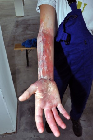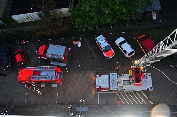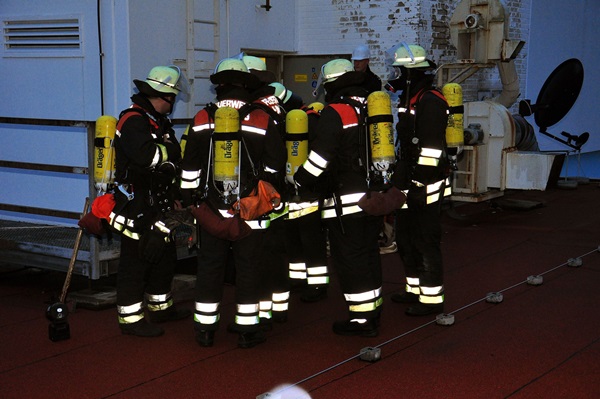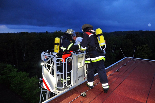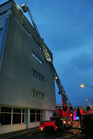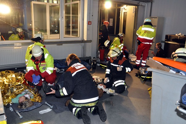 Es wurde ein Feuer auf dem Dach eines 5-geschossigen Gebäudes dargestellt, das durch Dacharbeiten ausgelöst wurde. Bei der Ausbreitung explodierten fiktiv auch Gasflaschen, dadurch wurden 7 Handwerker verletzt.