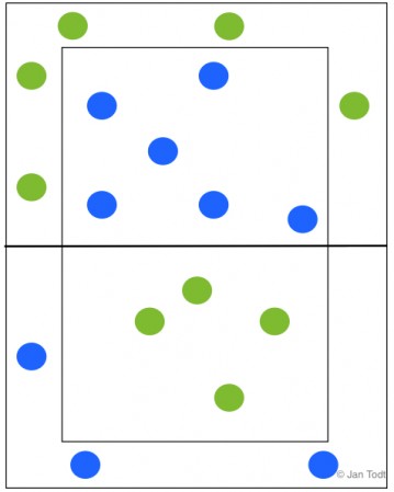 Von hier aus kann er dann versuchen, mit dem Ball einen Spieler aus Mannschaft A in dessen Spielfeld zu treffen.