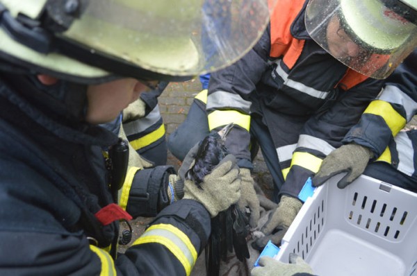 Nachdem die Leitung abgeschaltet wurde, überprüften Techniker des Energieversorgers auf einem naheliegenden Strommast, ob die Leitungen wirklich stromlos waren. Anschließend konnten zwei Kameraden vom Dach des Hauses, wo sich die Schnur verheddert hatte, die Krähe vorsichtig zur Straße abseilen, wo bereits weitere Einsatzkräfte warteten um sie entgegen zu nehmen. Man befreite das Tier von den Resten der Sehnen und brachte den verletzten Vogel in ein Tierheim, das die weitere Versorgung übernommen hat.