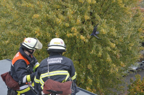 Anwohner in der Hans Böckler Strasse im Hamburger Stadtteil Horn bemerkten am Samstag Morgen gegen kurz vor 11:00 Uhr eine Krähe, die sich in einer Angelsehne verfangen hatte. Die Schnur hing von einem Hausdach über eine Starkstromleitung bis in einen naheliegenden Baum.