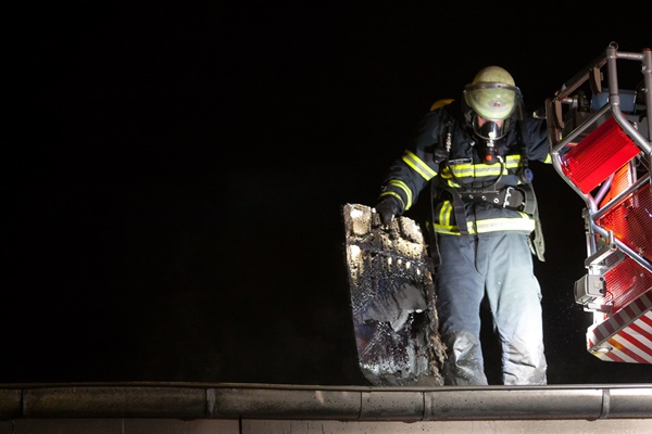 Anwohner informierten gegen 23 Uhr die Feuerwehr über Flammen aus einer ca. 150x20m großen Lagerhalle, welche durch Brandmauern in mehrere Brandabschnitte unterteilt war. Beim Eintreffen der Feuerwehr brannte die zweigeschossige Halle in einem Bereich von ca. 10×20 Metern. Die Einsatzkräfte nahmen drei C-Rohre im Innenangriff und ein C-Rohr und ein Wenderohr über Drehleiter im Außenangriff vor und konnten somit verhindern, dass sich das Feuer auf weitere Teile der Halle ausbreitete. Neben der Halle wurden mehrere PKW durch das Feuer beschädigt. Nachdem das Dach aufgenommen war, konnten die letzten Glutnester gelöscht werden und die Halle zur Brandursachenermittlung an die Polizei übergeben werden.