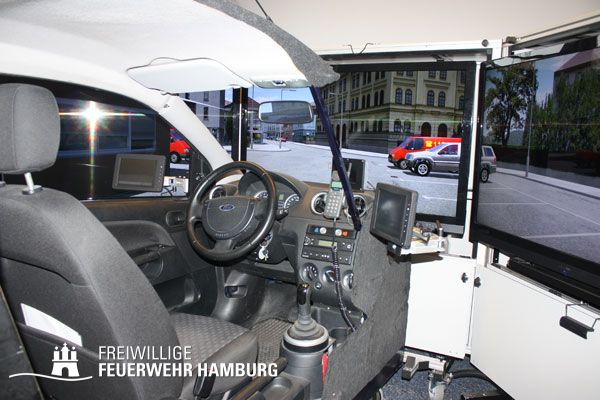 Ab sofort können sich angehörige der Freiwilligen Feuerwehr Hamburg in diesem Fahrsimulator fortbilden, um das sichere Verhalten im Straßenverkehr unter Sonderrechten zu üben.