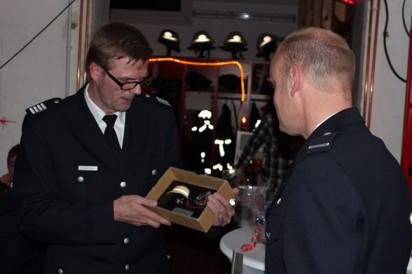 Nach den Lobesreden stellten sich alle aktiven Kameraden und der Bereichsführer auf und es wurde ein auf Frank und Heiko umgedichtetes Lied gesungen. Diese musikalische Einlage war die perfekte Überleitung in die anschließende Feier.