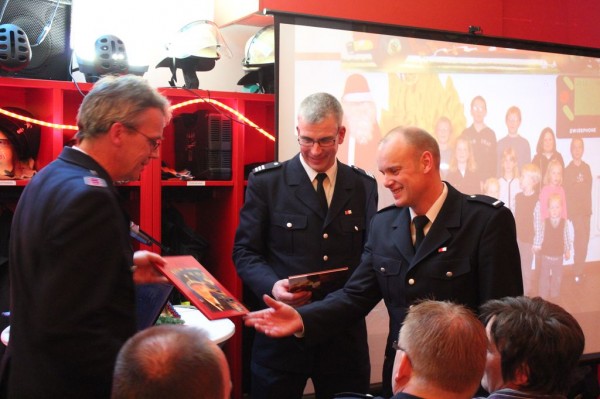 Es ist nun nicht verwunderlich, dass viele Wegbegleiter der Beiden am 12.12.2014 den Weg ins Gerätehaus fanden, um auf Frank und Heiko anzustoßen. Nach leckerem Grünkohl mit allem, was dazugehört, hielt Landesbereichsführer Wronski eine Rede und verlieh ihnen die Feuerwehrverdienstmedaille der zweiten Stufe im Namen des Präses der Behörde für Inneres und Sport. Im Anschluss daran war es Bereichsführer Karsten Dabelstein eine ganz besondere Freude, über Frank und Heiko zu erzählen, da er sie seit den Kindertagen kennt. Er selbst hat es auch noch nicht erlebt, dass Wehrführer und Vertreter am gleichen Tag damals eingetreten sind. Die Abschlussrede hielten die Gruppenführer der drei Gruppen in Vertreter der Kameraden, die mit einer kleinen Bildershow erneut bewiesen, wie lange doch 25 Jahre sind.
