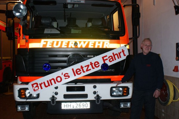 „Ich bin jetzt seit knapp 43 Jahren in der Freiwilligen Feuerwehr Curslack, davon 37 Jahre als Kraftfahrer. Noch nie musste ich einen Unfallbericht schreiben!“ erzählte Bruno Wulff gestern Abend und schaute dabei stolz in die Runde der Kraftfahrer der FF Curslack. Das sind wirklich zwei Dinge, die nicht jeder von sich behaupten kann. Seit fast 43 Jahren aktives Mitglied in der Einsatzabteilung – mehr geht nicht. Das haben sich die Kameraden von Bruno auch gedacht und beschlossen, ihn am Vorabend seines 60. Geburtstages auf eine letzte Fahrt zu schicken. Als Bruno nichts ahnend seine Geburtstagsfeier vorbereitete, klingelte der DME und Bruno eilte, während er sich die Klamotten zusammensuchte, zum Auto. Obwohl Bruno in 43 Jahren hunderte Einsätze miterlebt hatte, war er regelmäßig und immer mit viel Engagement dabei. Doch weit kam er nicht: das Löschfahrzeug stand schon mit Blaulicht vor seinem Haus. Sichtlich gerührt durfte er noch ein letztes Mal durch Curslack fahren und die anderen Kameraden, die ihn mit Feuerwerk begrüßten, einsammeln. Nach einem Gruppenabschlussbild und leckerem Essen wurden die letzten Stunden vor dem Wechsel in die Ehrenabteilung gefeiert.