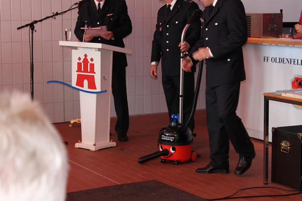 Auch der Bereichsführer Torsten Hansche ließ es sich nicht nehmen und richtete noch ein paar Worte an die Wehr. Der Bereich Wandsbek übergab der Wehr ebenfalls ein kleines Startkapital. Ebenfalls bekam die Wehr einen Neuzugang namens Henry, der sich als ein Staubsauger entpuppte.