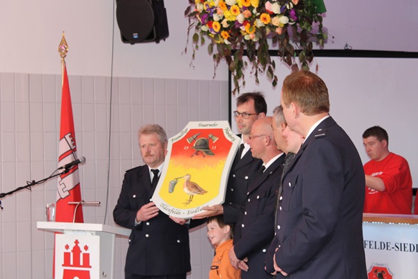 Und zu guter Letzt kamen noch die Oldtimer Freunde Oldenfelde Siedlung mit ein paar Worten und übergaben der Wehr ein Wehrwappen.