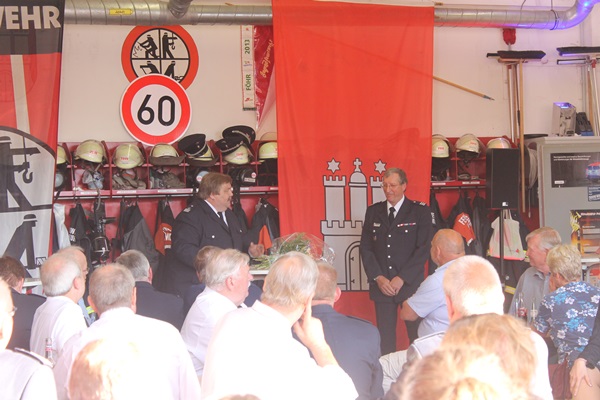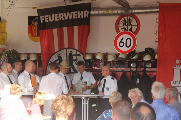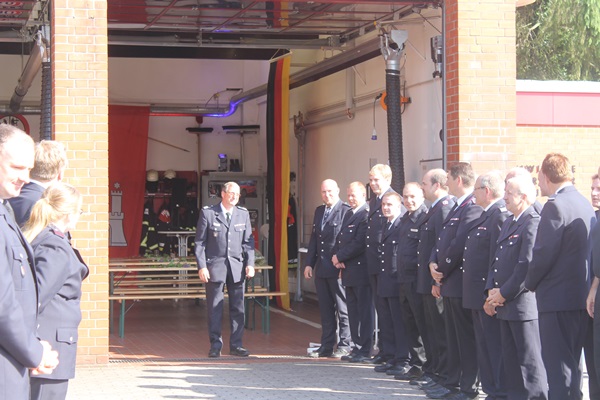 Um seinen Abschied aus der Einsatzabteilung ausgiebig zu feiern, hat die Wehr sich eine kleine Überraschung einfallen lassen. Mit beiden Löschfahrzeugen ging es zu ihm nachhause um ihm eine letzte Fahrt zu ermöglichen. An der Wache warteten neben der Einsatzabteilung und Jugendfeuerwehr auch weitere zahlreiche Gäste. Es gab ein striktes Programm, das durchgeführt wurde. Die Wehrführung, Landesbereichsführer André Wronski, Bereichsführer Torsten Hansche, die Jugendfeuerwehr und die Partnerwehr Insel richteten ein paar Worte an ihn und seine Frau Anne, die Armin immer den Rücken frei hielt. Auch an Geschenken durfte es nicht fehlen. Highlight war ein Feuerwehrgartenzwerg, der von der Jugendfeuerwehr überreicht wurde.