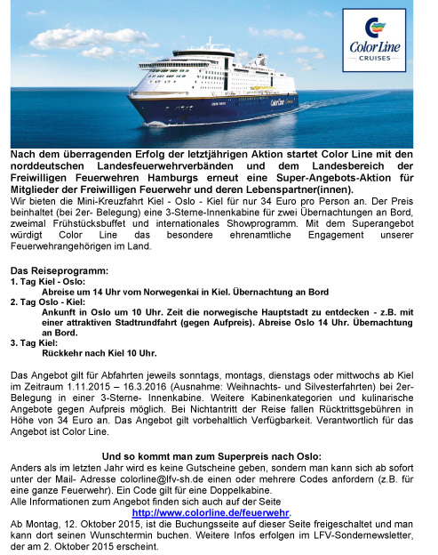 Color Line startet erneut eine Super-Angebots-Aktion für Mitglieder der Freiwilligen Feuerwehr und deren Lebenspartner(innen).