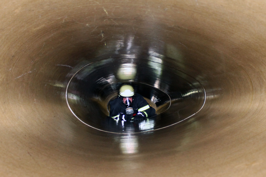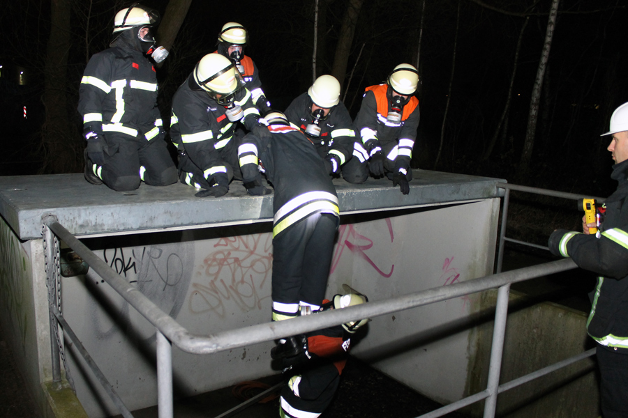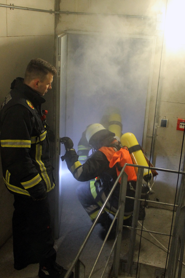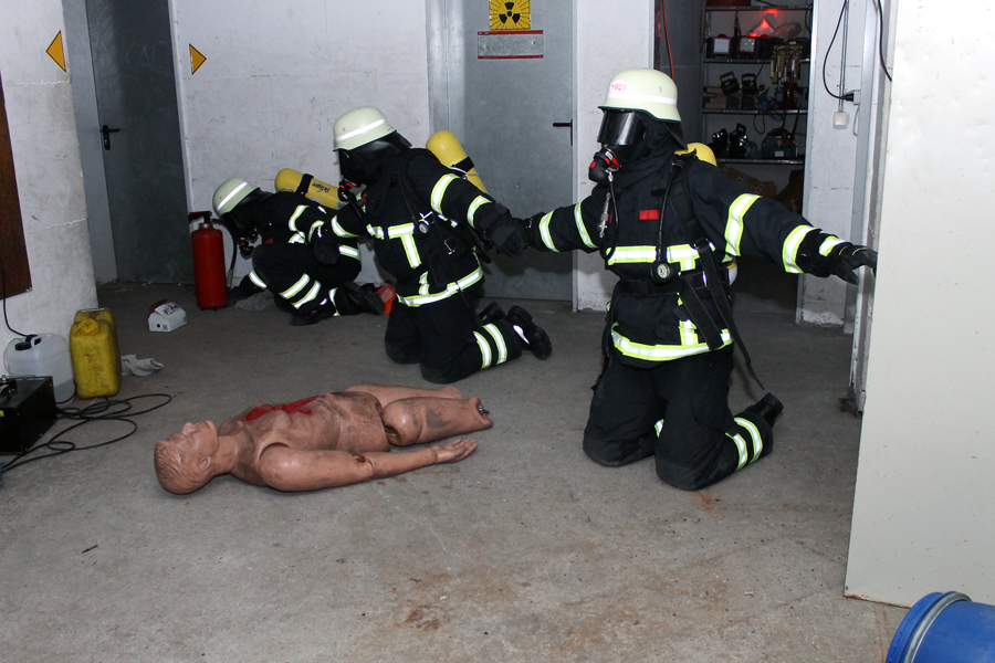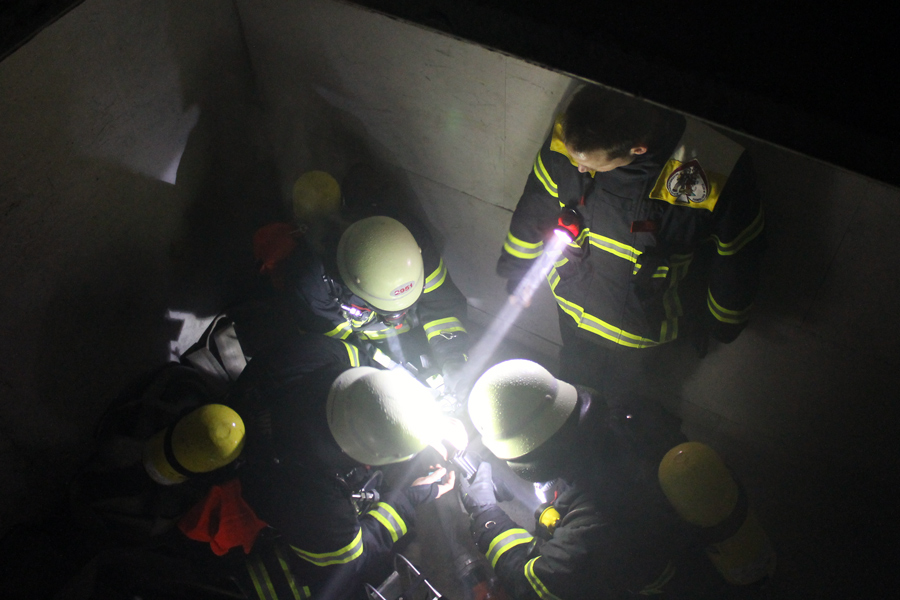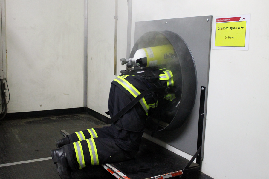 Nachdem die ersten Übungen mit Atemschutzgerät am Vorabend gemacht wurden, stand nun der Flaschenwechsel an. Auch dies müssen die Kameraden selbst können. Hierbei ist stets auf den Druck der Flasche zu achten und auf den richtigen Sitz der Trägerplatte sowie der Druckleitungen. Weiter ging es mit Laufen und Kriechen. Die Atemschutzträger müssen nun unter einer Straße durch eine Betonröhre hindurch, die in den Übungsbahnhof führt. Dort müssen alle unter dem Bahnsteig entlang im Dunkeln kriechen und den Ausgang finden. Nach einer kurzen Verschnaufpause wurde erst theoretisch und dann praktisch das Retten von Personen mit dem Bergetuch und der Schleifkorbtrage geübt. Hierbei muss auf die richtige Lagerung des Patienten geachtet werden. Das Herab- oder Heraufsteigen von Treppen bei Nullsicht wurde ebenfalls trainiert. Die Kameraden mussten einen Verunfallten so schonend wie möglich das Treppenhaus hinunter bringen.