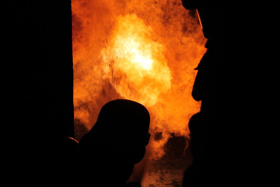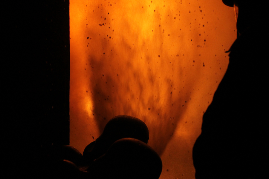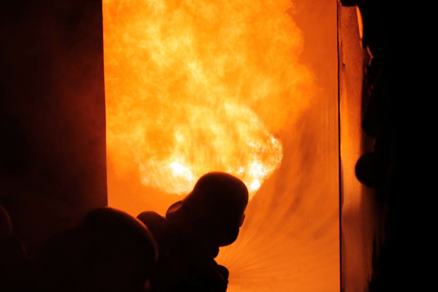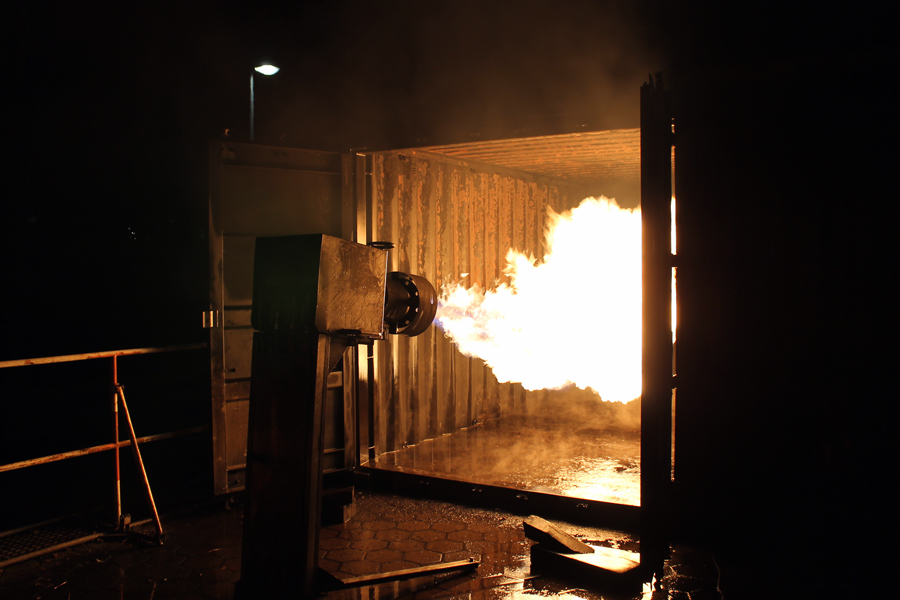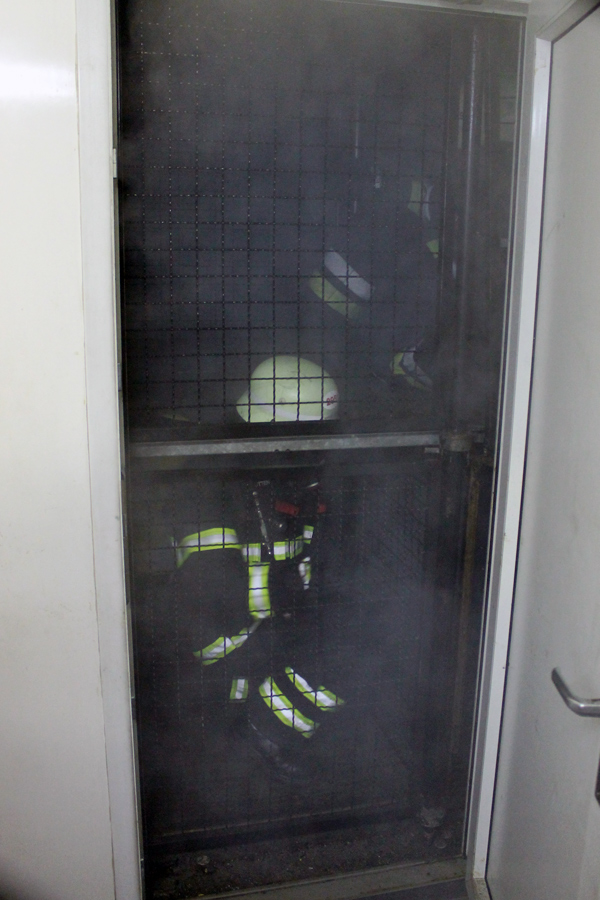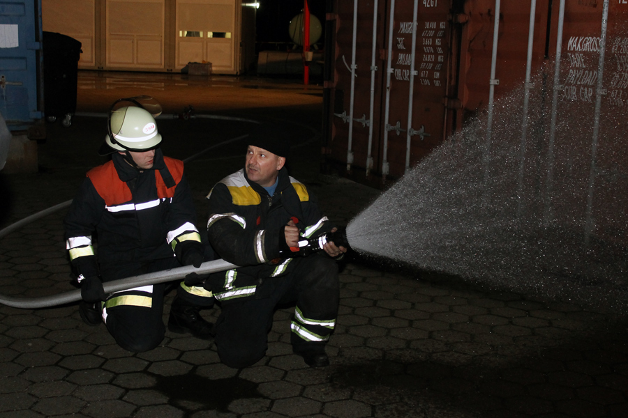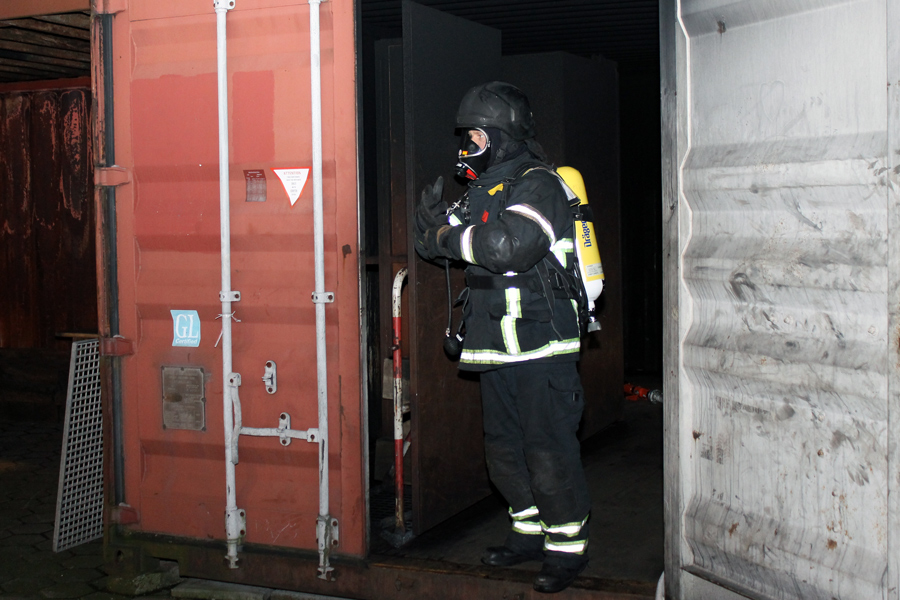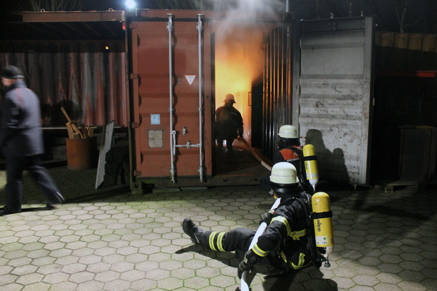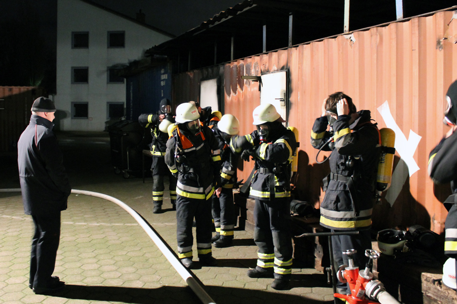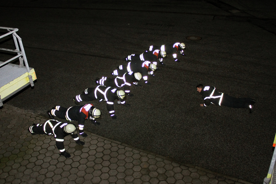Am letzten Abend wurde theoretisch die Brandbekämpfung bzw. das Strahlrohrtraining durchgeführt. Der Ausbilder erklärte das richtige Vorgehen bei der Rauchgaskühlung und den Umgang sowie die Möglichkeiten mit dem Fogfighter. In der Zeit wurde auf dem Außengelände schon mal die Zimmerbrandanlage (ZBA) vorbereitet. Diese Anlage ist mit zwei Containern in L-Form aufgebaut. Ein riesiger Gasbrenner stößt auf Knopfdruck eine Flamme in einen der beiden Container. In dem Anderen befindet sich ein Ausbilder mit zwei Atemschutzgeräteträgern. Der Truppführer muss nun die Tür zum Brandraum (Container) mit einem Streichen des Handrückens über die Tür überprüfen. Dies erfolgt von unten nach oben, um einen Hitzeanstieg festzustellen. Sobald eine starke Hitze zu spüren ist, wird die Hitzegrenze durch raufklopfen markiert, um dem Truppmann zu zeigen, wie groß die Gefahr einer Rauchgasdurchzündung ist. Beide Kameraden sitzen von der Scharnierseite der Tür abgewandt, um im Falle einer Durchzündung nicht von der Tür getroffen zu werden. Sobald beide sich abgesprochen haben, öffnet der Truppführer die Tür mit der Axt, wobei der Truppmann mit dem Strahlrohr in die Türzarge rutscht und 3 Stöße im 45° Winkel an die Decke gibt. Danach ziehen sich beide sofort zurück und schließen die Tür. Dieses wird solange wiederholt bis nur noch Wassertropfen von der Decke kommen und kein Wasserdampf. Außerdem wurden weitere Löschtechniken gezeigt, die jeder Auszubildende in der ZBA trainieren musste. Nach diesem heißen und anstrengendem vorletzten Teil des Lehrganges wartete nun das Ende – der Durchgang durch die Mobile Atemschutzübungsstrecke (MOBAS). Hier mussten alle noch einmal durch kleine sportliche Übungen wie Fahrradfahren, Endlosleiter steigen und Gewichte heben ihre Fitness beweisen. Zum Schluss wartete der Kriechkäfig, in dem es in zwei Ebenen mit Rauch und Hitzestrahlern eng und warm wurde. Aber auch dies meisterten die Kameraden super.