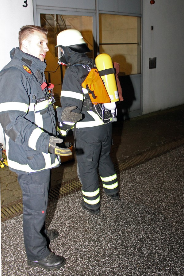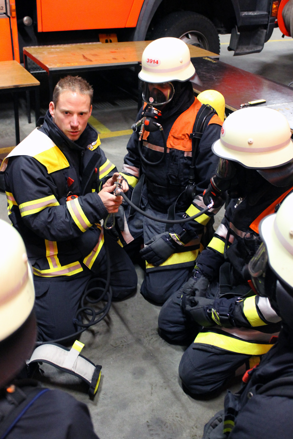 Dieser Abend startet mit einer Lernerfolgskontrolle, bei der das theoretische Wissen in einem schriftlichen Test von ca. 30 Fragen in 60 min geprüft wird. Nach dem Test wird das Thema Atemschutznotfalltraining vertieft. Immer wieder kommt es weltweit zu schweren Unfällen im Atemschutzeinsatz. Oft liegt es auch an defekten Atemschutzgeräten. Hier ist es wichtig zu lernen, dass bei plötzlichem Luftmangel in der Maske nicht die Beherrschung verloren werden darf. Der erste Handgriff muss in solch einem Fall immer an das Flaschenventil führen. Hier hat sich oft gezeigt, dass sich die Ventile durch rutschen an der Wand zudrehen können. Es können aber auch andere Defekte sein, wie ein dauerhaftes Druckluftabströmen des Lungenautomaten oder auch einer defekten Druckleitung oder Atemluftleitung. Der erste Griff zum Ventil kann somit eine kurze Lösung sein, um sich zu helfen. Mit diversen Übungen wurde dies versucht, den Kameraden beizubringen, z.B. in dem ein Ausbilder hinter den Auszubildenden lang ging und ohne Ankündigung ihre Ventile zudrehte.