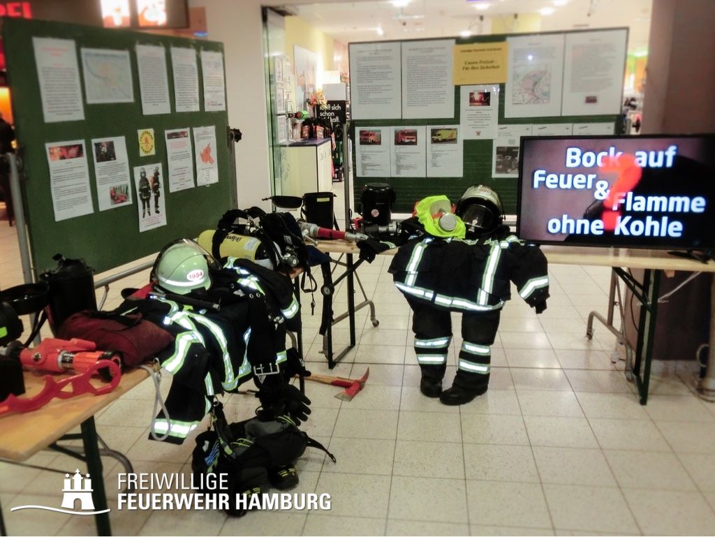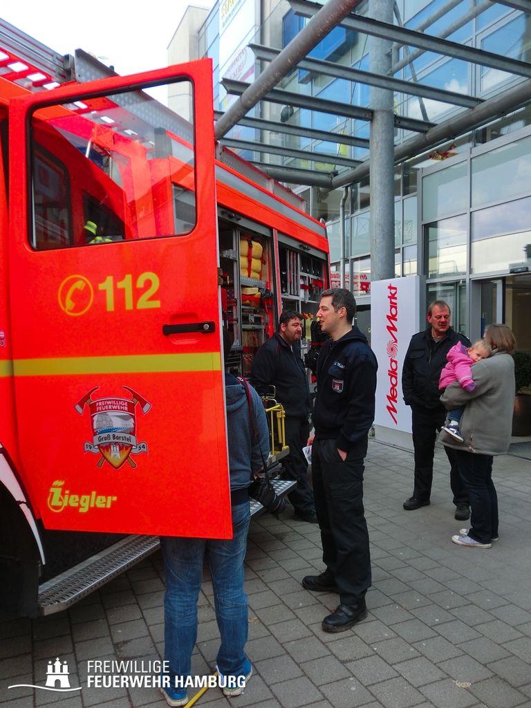 Die Kameraden der FF Groß Borstel waren in der Woche vom 4. bis 9. April 2016 täglich im Nedderfeld-Center, um über die Arbeit der Freiwilligen Feuerwehr zu informieren und – idealerweise – einige Menschen für das Engagement in der Freiwilligen Feuerwehr zu interessieren.