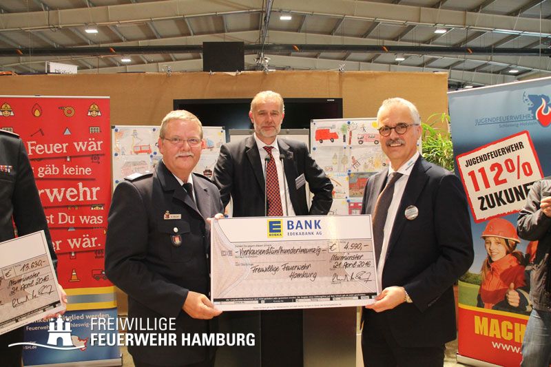 Die Freiwilligen Feuerwehren in Hamburg bekamen bei diesem Anlass 4.590 Euro aus dieser Summe gutgeschrieben, die LBFG Andreas Neven in Form eines Schecks übernahm.