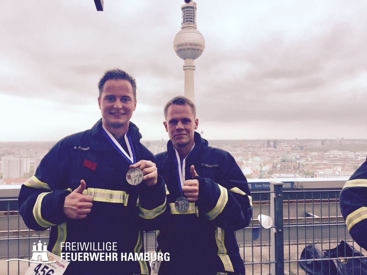 Neben dem fantastischen Ausblick über Berlin belohnten sich die beiden Kameraden Marc Neumann und Maximilian Kummer mit dem 56. Platz von insgesamt 360 Teams. Dieses sehr gute Ergebnis konnten sie nur durch wochenlanges und intensives Training in einem Hamburger Hochhaus erreichen.