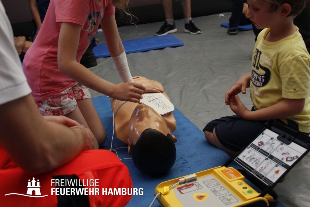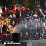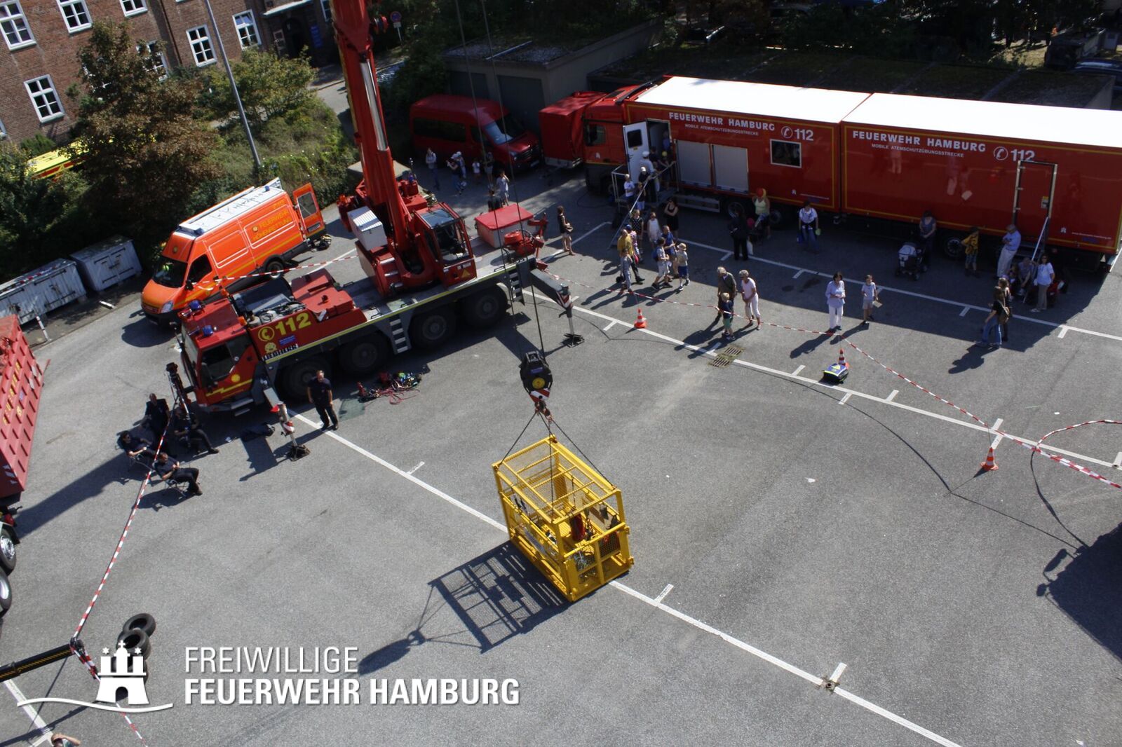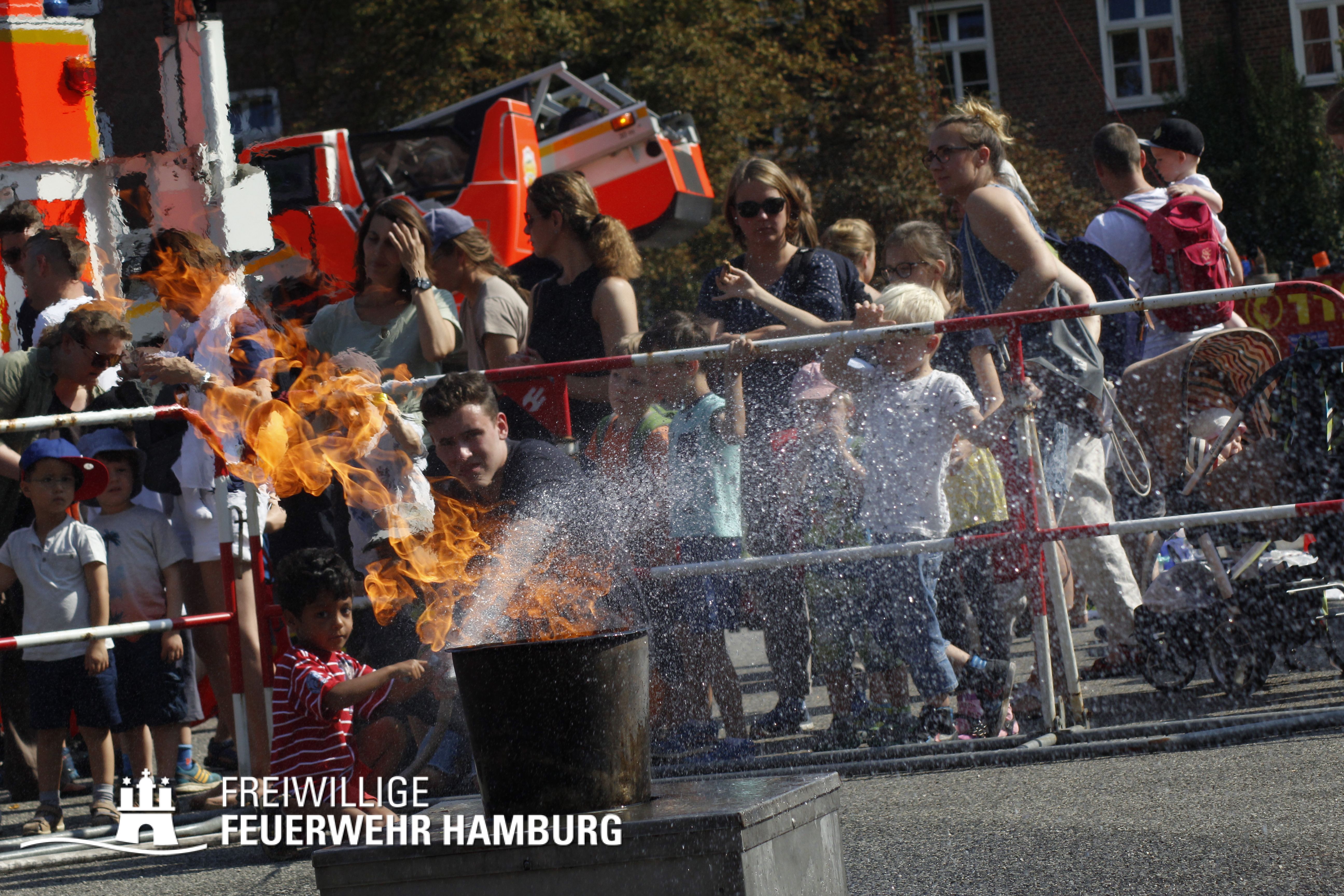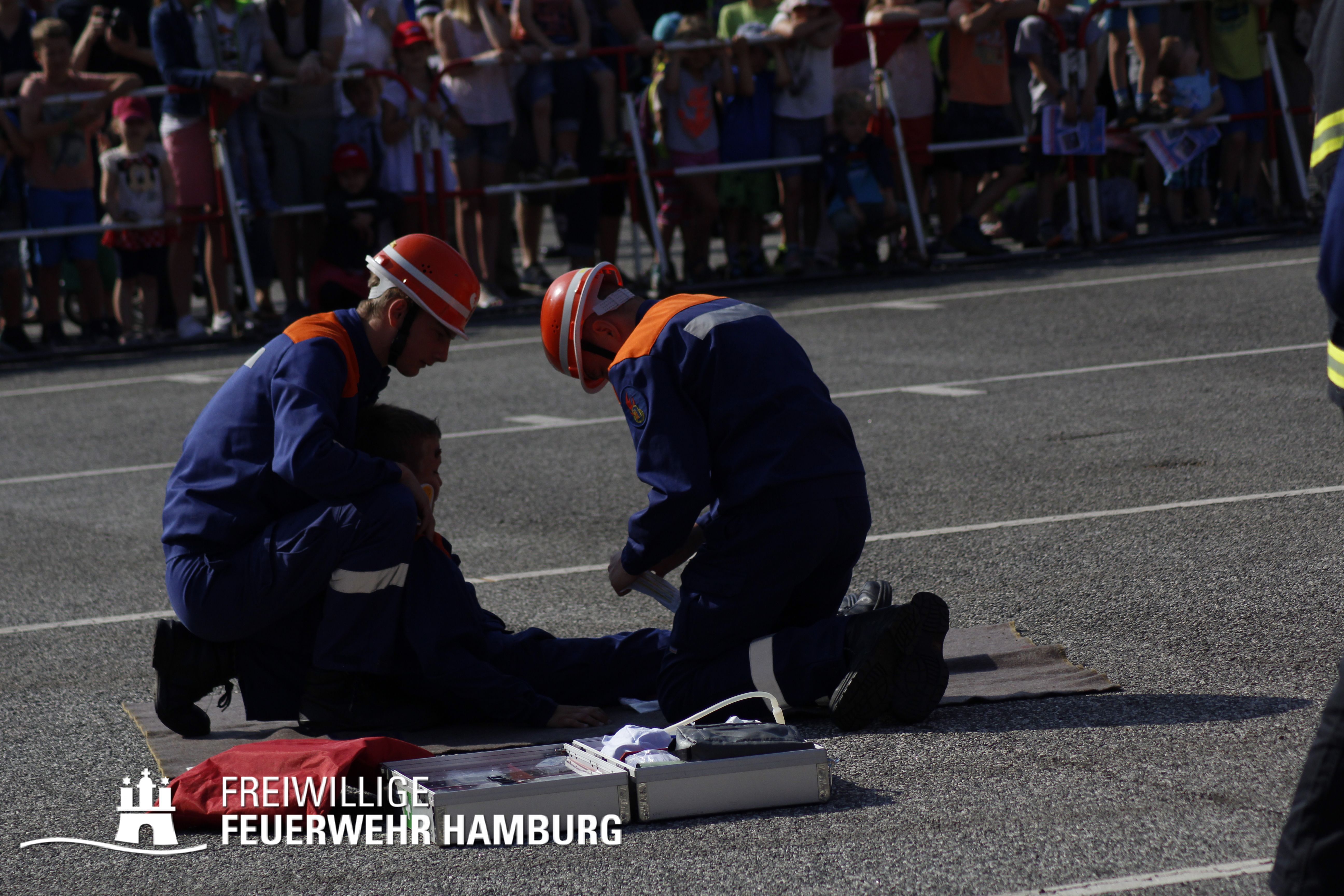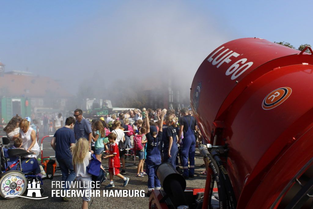Über den gesamten Tag war es den Kids möglich in fast alle Bereiche der Polizei, Feuerwehr, THW und des Rettungsdienstes zu schauen. Zusammen mit den Kollegen der Berufsfeuerwehr gab es seitens der Feuerwehr Hamburg viel zu sehen. Neben den normalen Löschfahrzeugen war es auch möglich Sonderfahrzeuge, sowie deren Aufgaben zu bewundern. Die Höhenretter zeigten in luftiger Höhe ihre Seilkünste und retteten einen Patienten aus einem Korb des Feuerwehrkrans. Jedes Kind, welches sich das Klettern zutraute, konnte mit den Höhenrettern einen Turm aus Getränkekisten bauen.