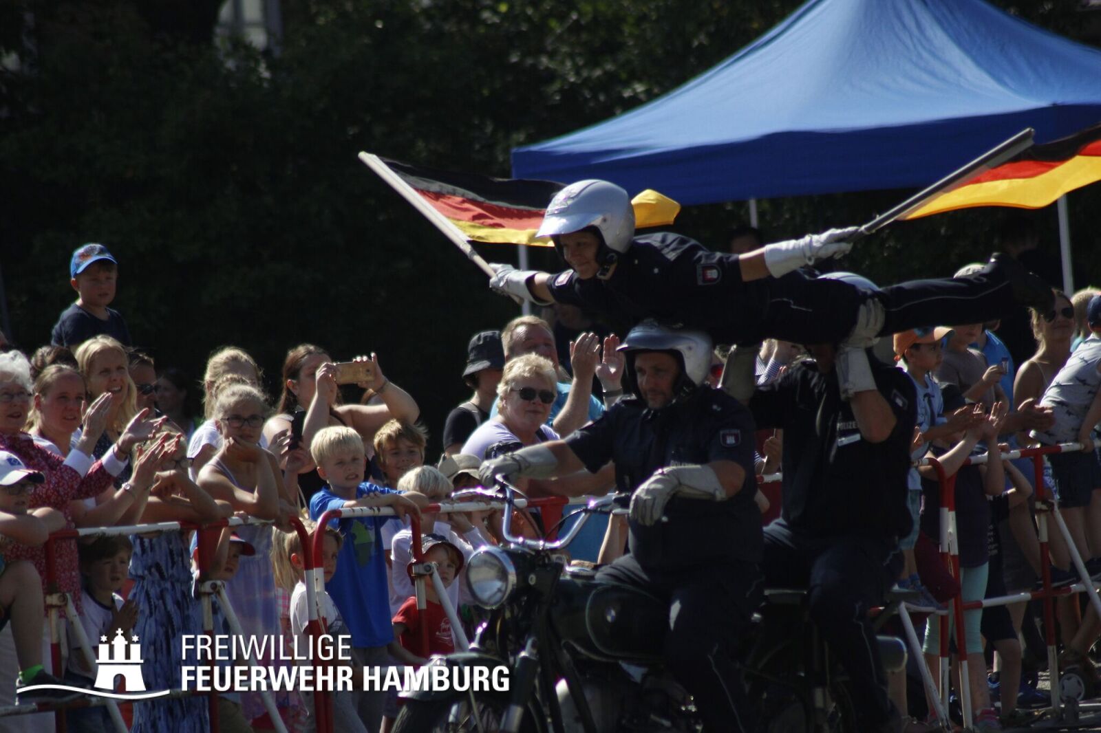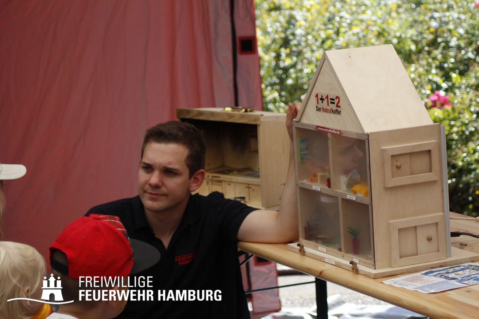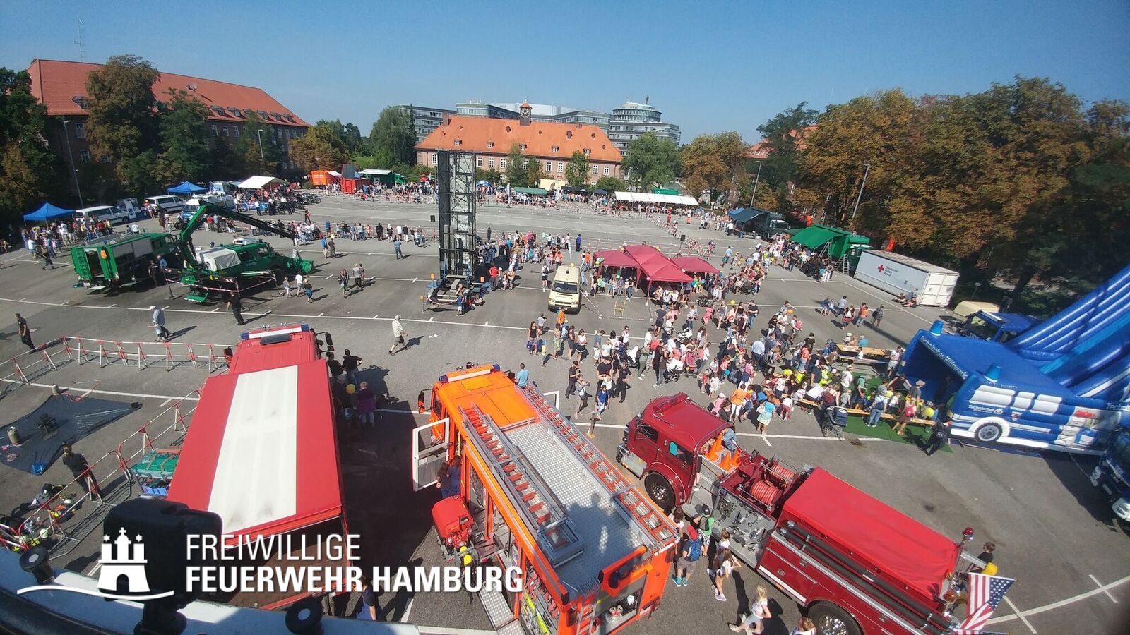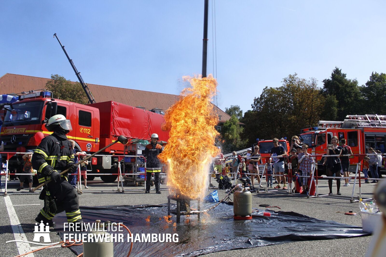 Über den gesamten Tag war es den Kids möglich in fast alle Bereiche der Polizei, Feuerwehr, THW und des Rettungsdienstes zu schauen. Zusammen mit den Kollegen der Berufsfeuerwehr gab es seitens der Feuerwehr Hamburg viel zu sehen. Neben den normalen Löschfahrzeugen war es auch möglich Sonderfahrzeuge, sowie deren Aufgaben zu bewundern. Die Höhenretter zeigten in luftiger Höhe ihre Seilkünste und retteten einen Patienten aus einem Korb des Feuerwehrkrans. Jedes Kind, welches sich das Klettern zutraute, konnte mit den Höhenrettern einen Turm aus Getränkekisten bauen.