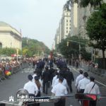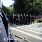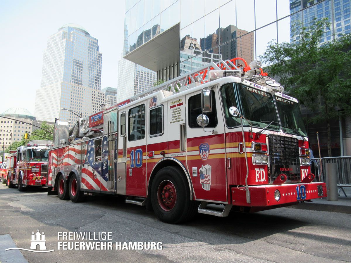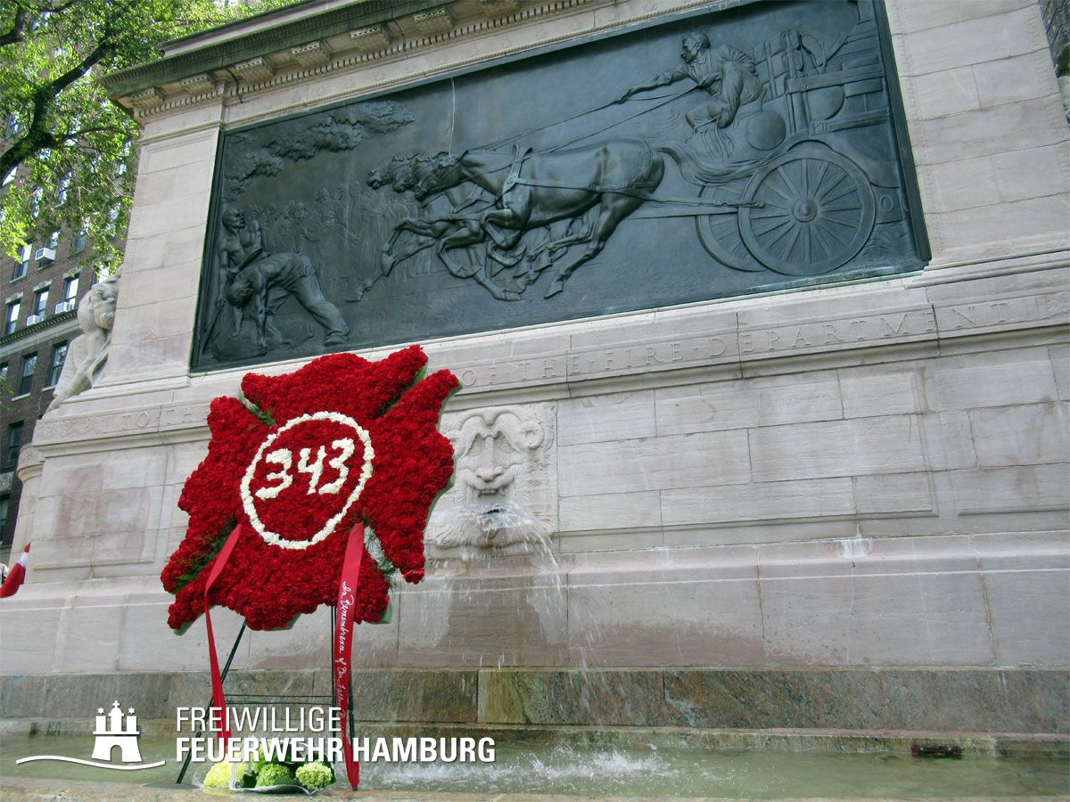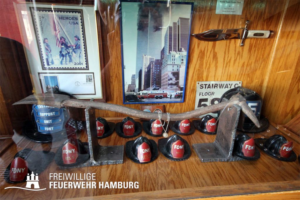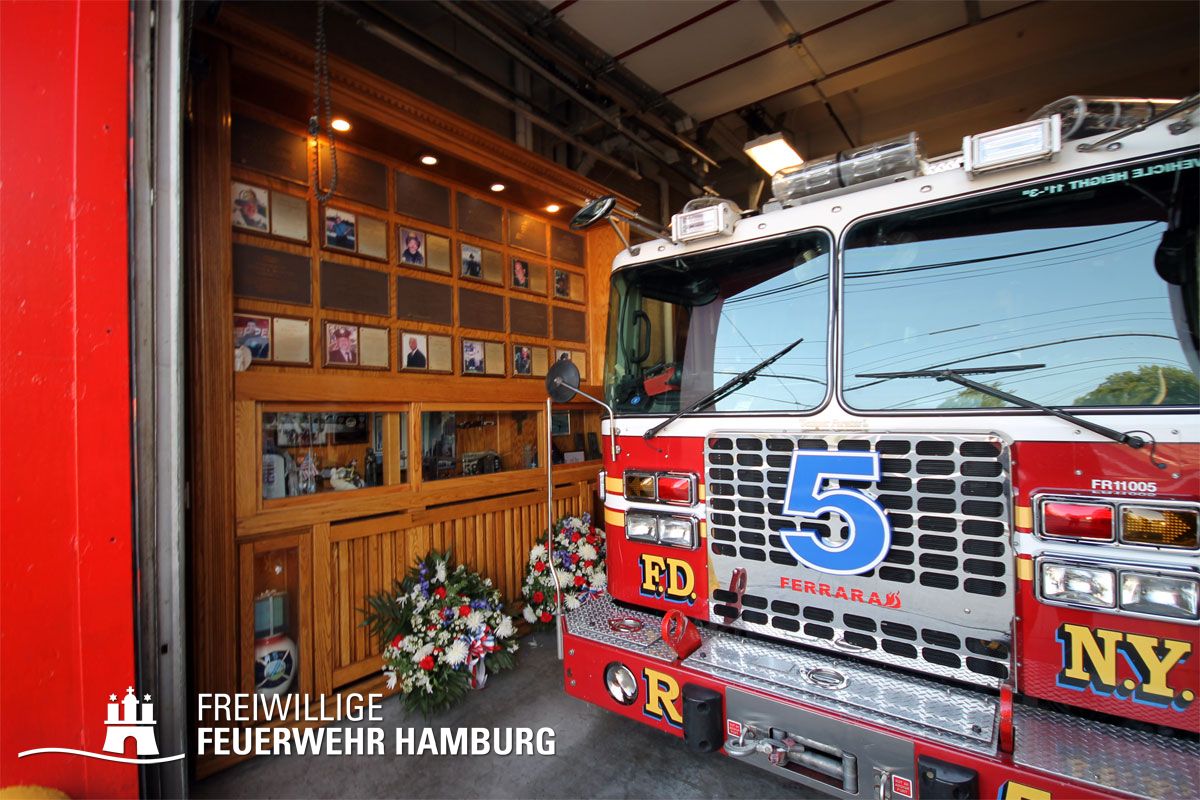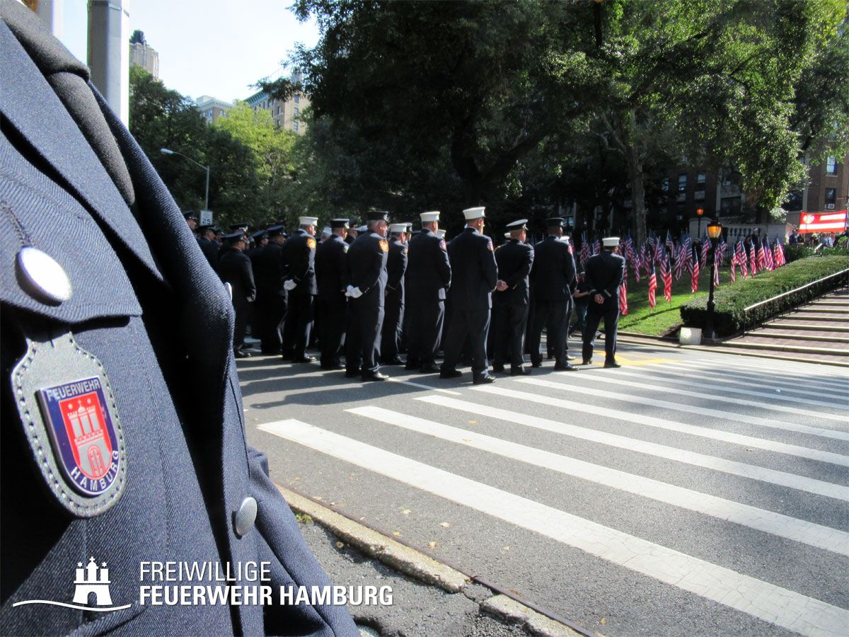 Am 11.9. war es dann soweit. Wir waren mit der Reisegruppe zur Trauerfeier am Central Park eingeladen, bei der den verstorbenen Kollegen des Terroranschlages auf das World Trade Center gedacht wurde. In einer riesigen Zeremonie wurden die gefallenen Feuerwehrmänner geehrt, indem ihre Namen, Einheit und Dienstgrade verlesen wurden. Danach gab es für jeden einen Glockenschlag. Anschließend ging es ins Hauptquartier, wo nochmal eine spezielle Veranstaltung für die Angehörigen stattfand. Am Ground Zero in Manhatten befindet sich die Feuerwache 10, das sogenannte „Ten House“. An dieser Wache gibt es ein Denkmal für die 343 verstorbenen Kameraden vom 11. September. Dort nahmen wir ebenfalls gegen Mittag an einer Trauerfeier teil.